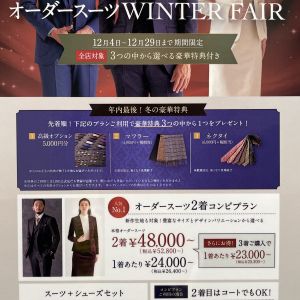こんにちは。 今年最後のフェアのご紹介です。 スーツ2着のご購入で ・オプション5,000円分無料 ・マフラーかネクタイをプレゼント こちらのどちらかが特典で ...