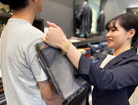 安心の研修制度 - ファッションに興味はあるけど、経験が…と二の足を踏む未経験の方にも安心。当社は店舗でのOJTを中心に、複数店舗を統括するSV(スーパーバイザー)による臨店研修や社歴や習熟度が同じぐらいの方を対象とした集合研修など採寸や接客をイチから学べる研修体制を整えています。まずは検品や接客補助から始め、徐々に知識を身につけてひとり立ちへ。早い方なら入社2ヵ月目にはスタイリストデビューも可能!