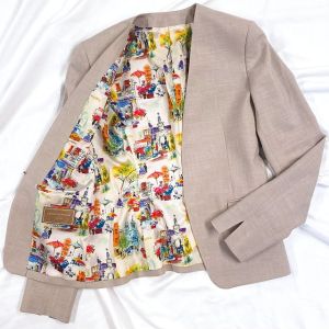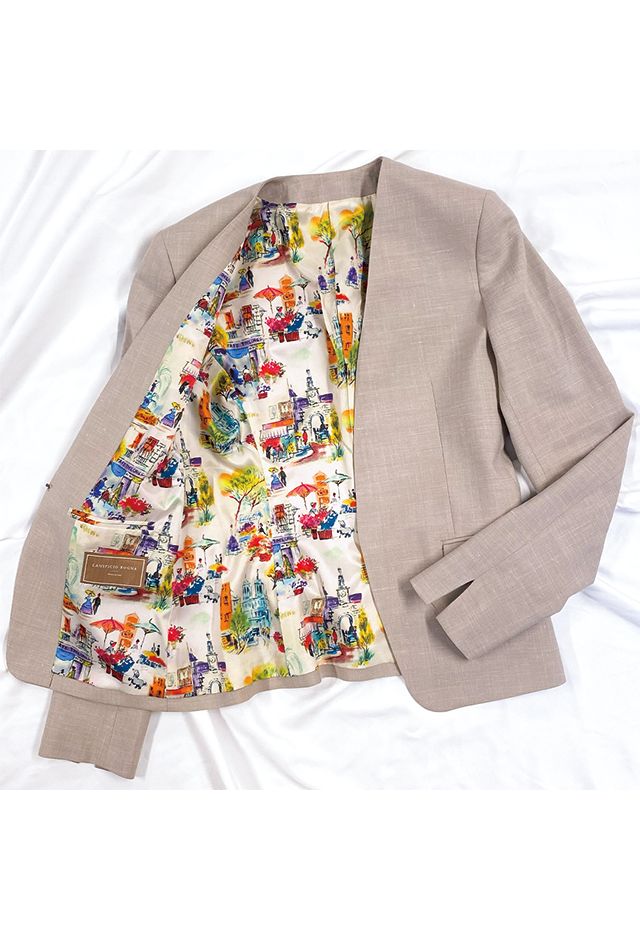 高級スーツ地やジャケット地を専門に製造する生地ブランド「ローニャ」で仕立てたスーツです。上品な印象を与える明るめのベージュスタイルで、春夏シーズンの生地になります。ジャケットはノーカラーデザイン(ホック)、ボトムスはクールなセミフレアパンツで仕立てました。裏地には、カラフルでおしゃれな街並みが印象的なベージュを採用。ビジネスシーンでも堅すぎず、親しみやすさと華やかさをバランス良く表現できるコーデです。