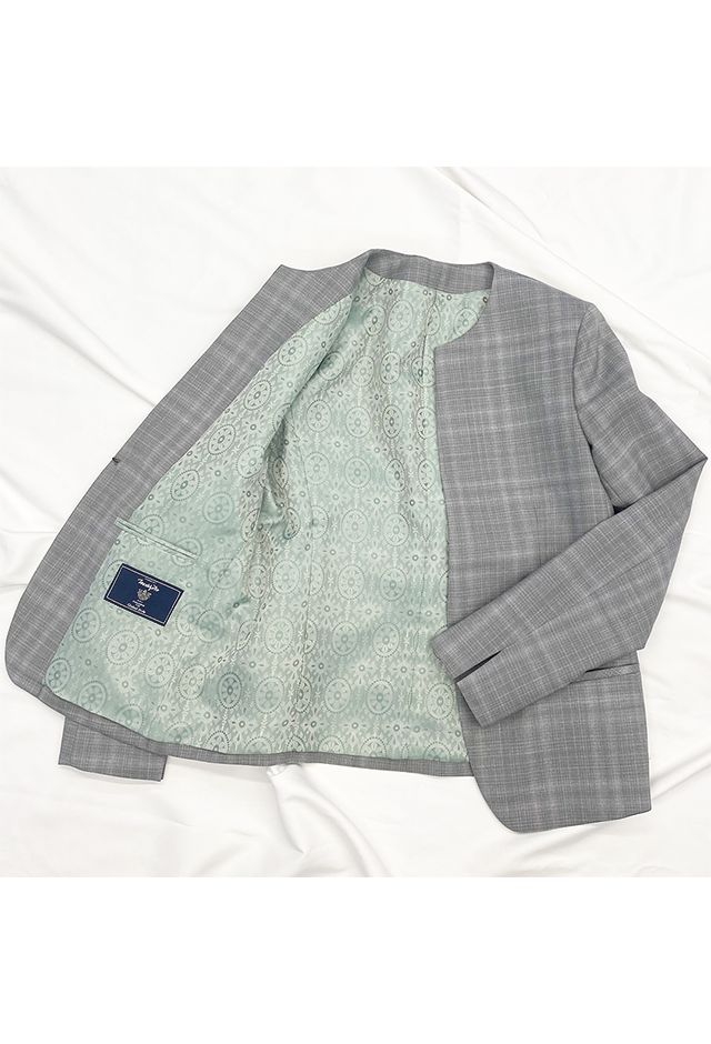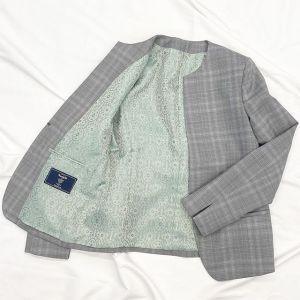 トレンドをふんだんに取り入れたデザイン性が特徴の「マルゾット」で仕立てたスーツです。ライトグレーに奥行きを感じるチェック柄のスタイルで、オールシーズン着用していただけます。ジャケットはノーカラーデザイン(クルーネック/ホック)、ボトムスは定番のタイトスカートで仕立てました。ジャケットはフラップのないポケットが、シンプルなデザインを際立たせ、生地の上質さを引き立てます。ネイビースカートとのシンプルな組み合わせはビジネスシーンにもぴったり。ブローチを添えれば、式典やパーティーなどのイベントシーンでも活躍するコーデに。