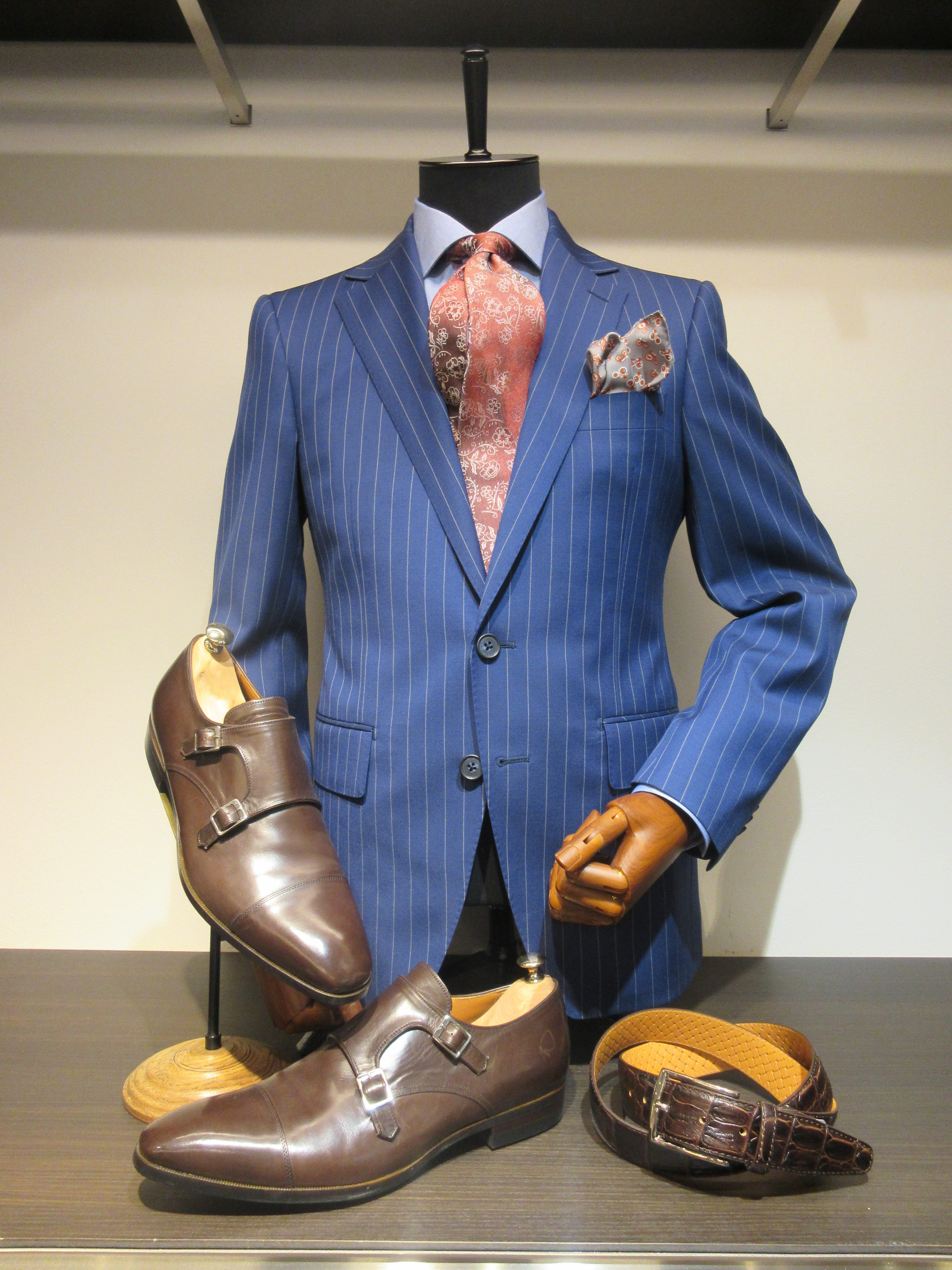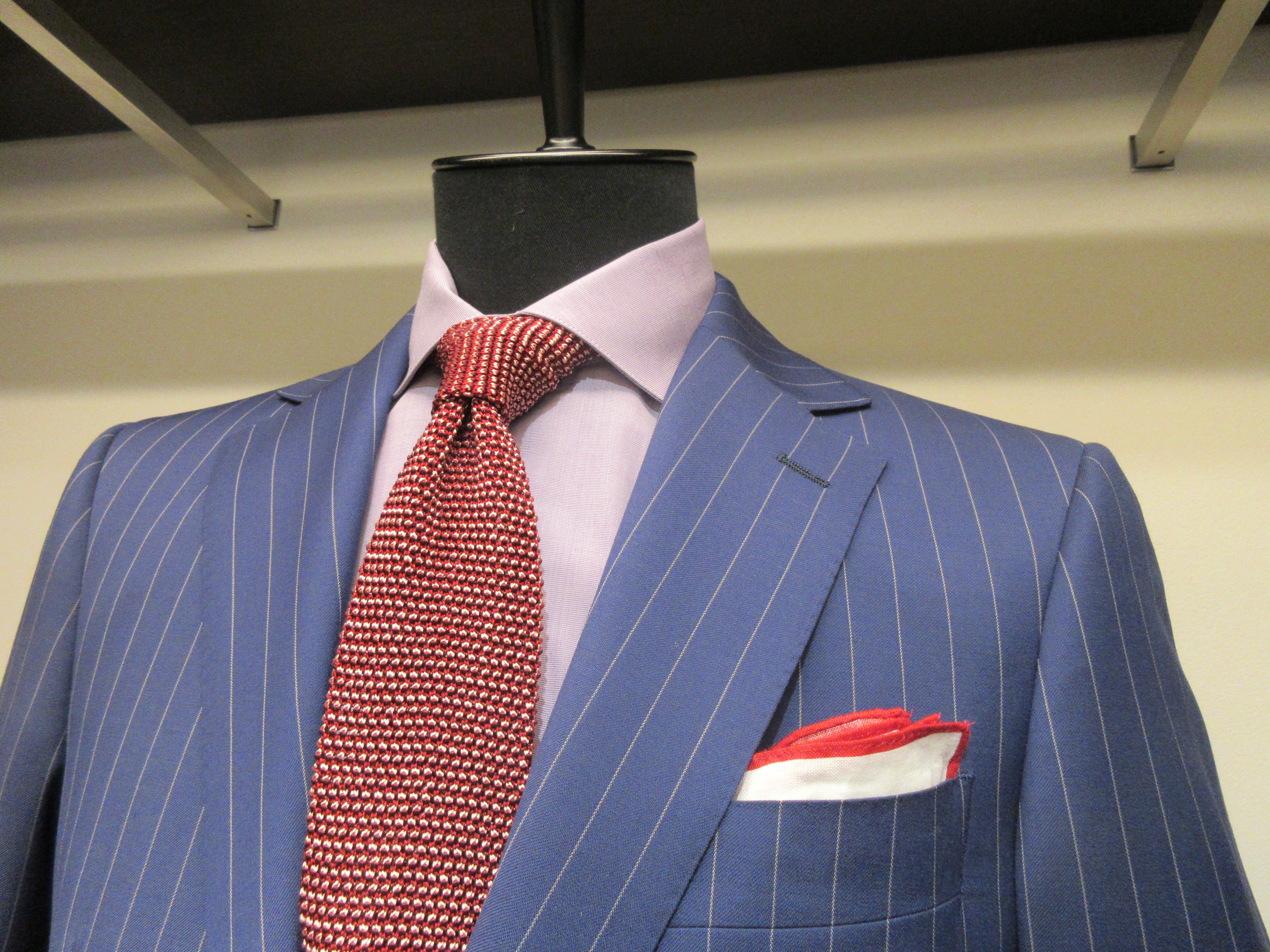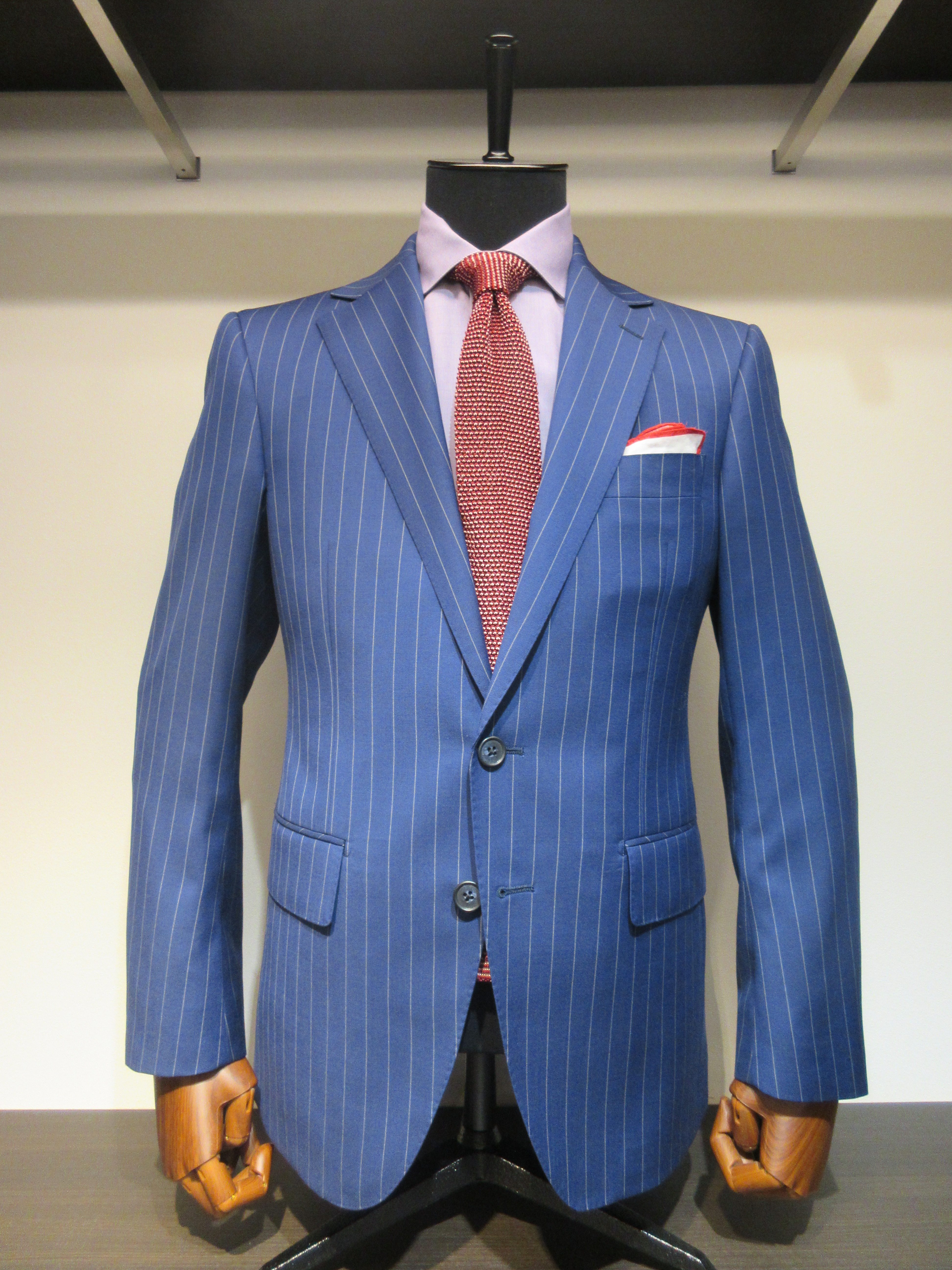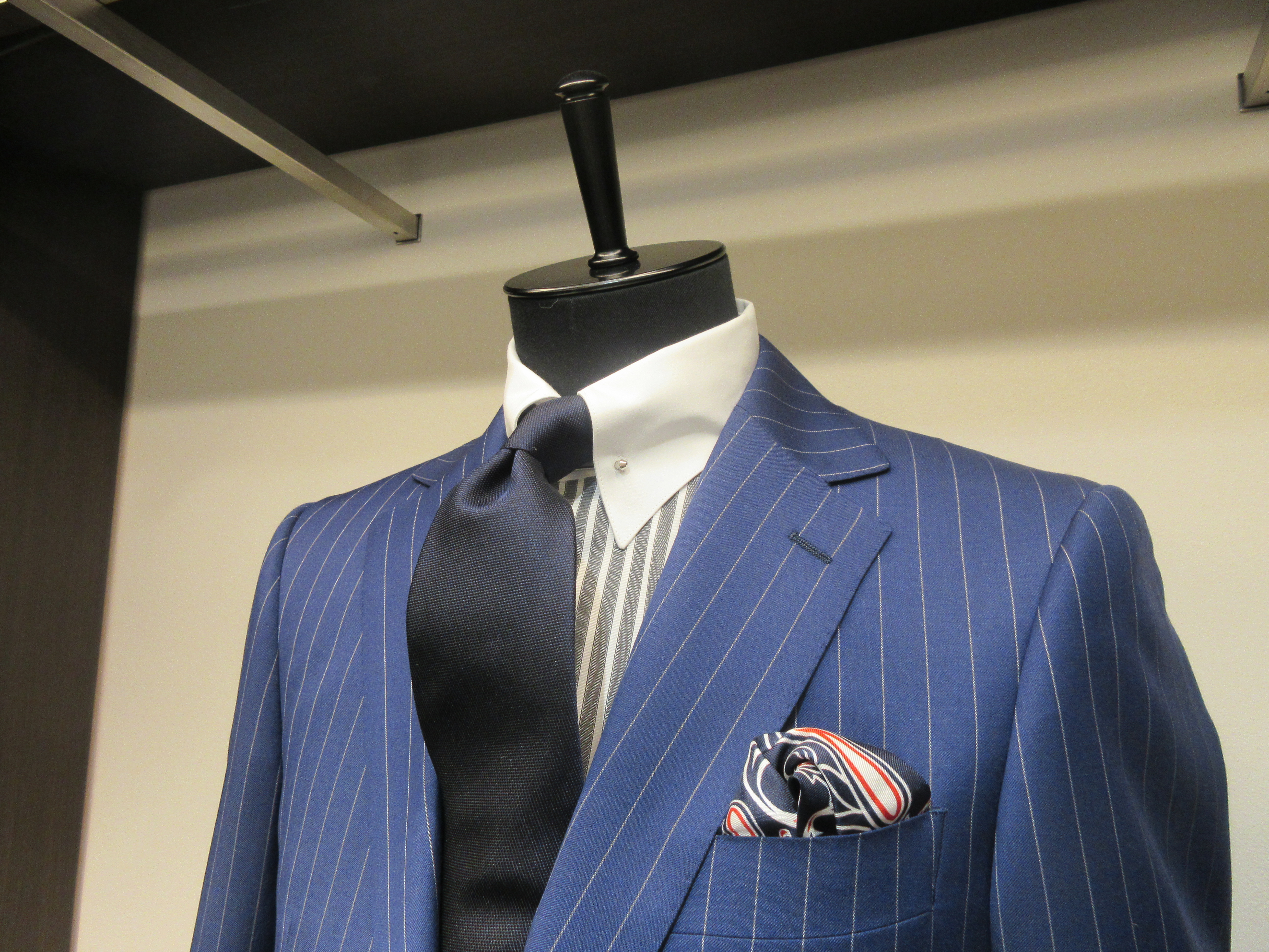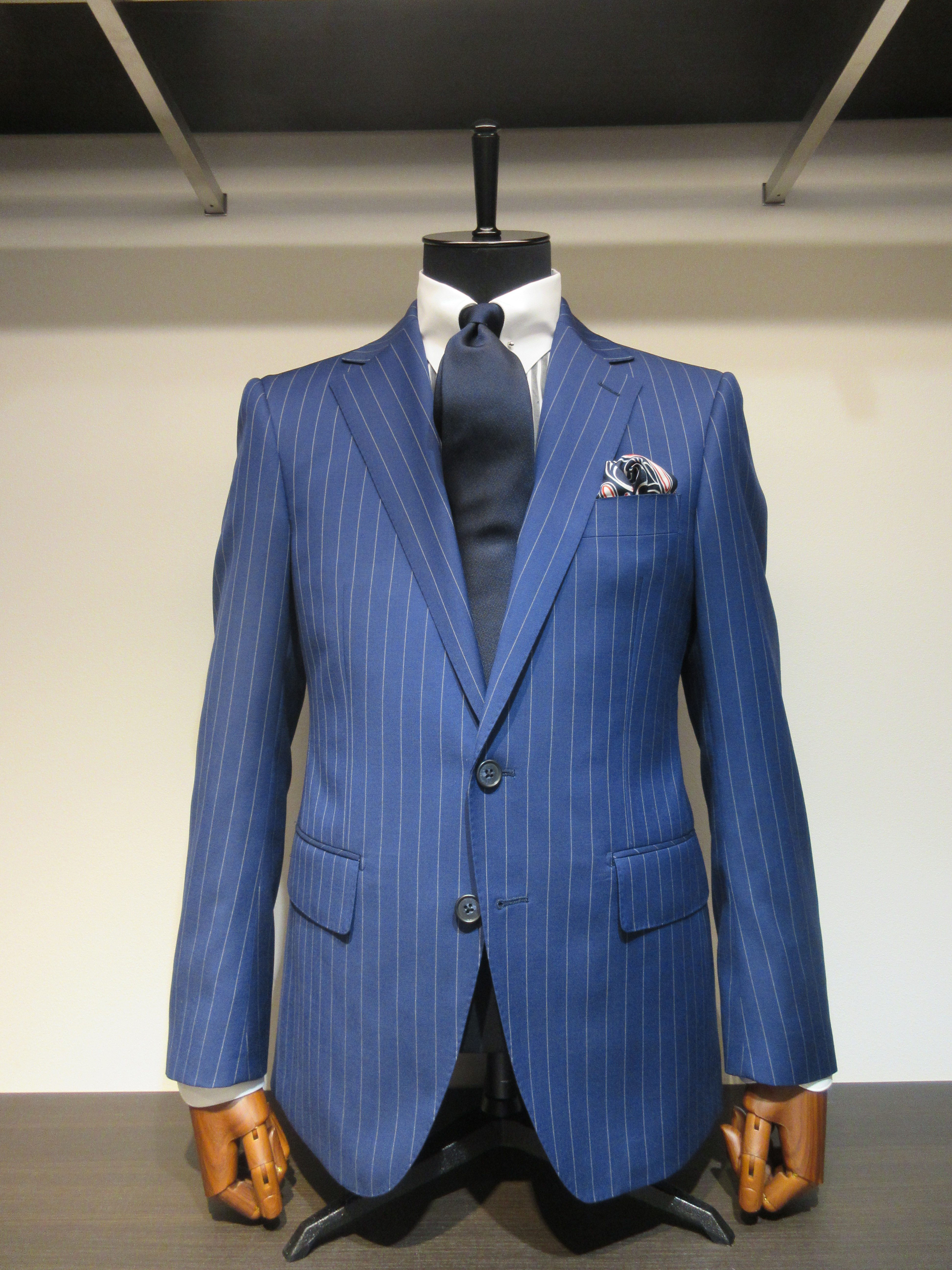 今回はビジネスマンに人気がある、ネイビーストライプの生地で仕立てたスーツをご紹介いたします。