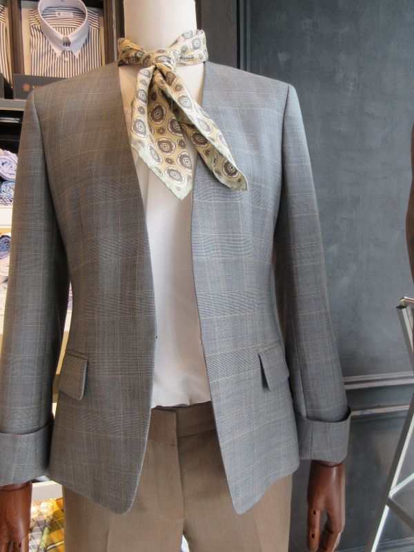 レディースのスーツでも襟付きのジャケットが基本的かと思います。