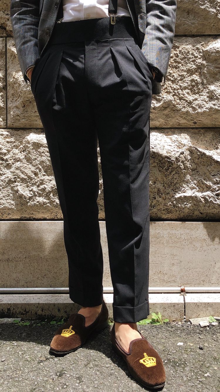 スラックスはタック入りで腰回りにはしっかりとゆとりを取りながら