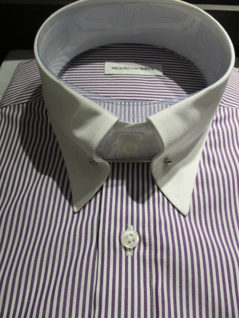 襟先の中ほどにアイレット(ハトメ)と呼ばれる穴がありピンを通して仕様する襟シャツ。