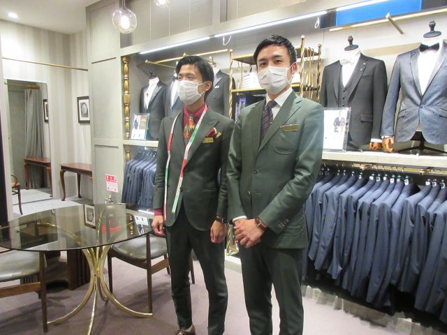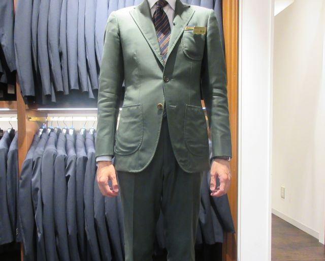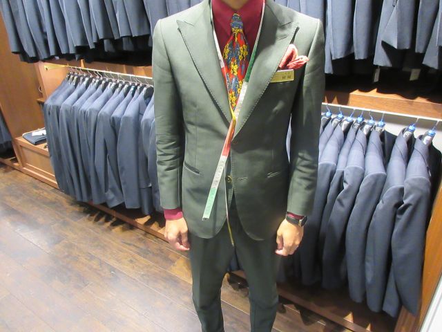 グリーンのスーツスタイルは着れるシーンこそ少ないもののかなり華やかな印象を演出できる人気の生地でございます。成人式のみならずご自身の結婚式などにもお使いができるので気になる方は是非店頭にてご覧になっていただければと思います。皆様のご来店お待ちしております