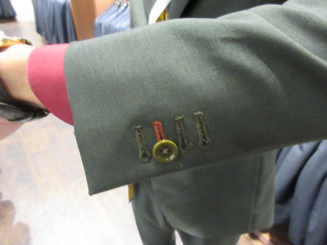 村崎店長は火の国熊本にちなんで情熱の赤を交えたカジュアルなスタイル。ネクタイも袖の穴かがりも色合わせで遊びまくってます。ファッションが好きなのがビシビシと伝わります。