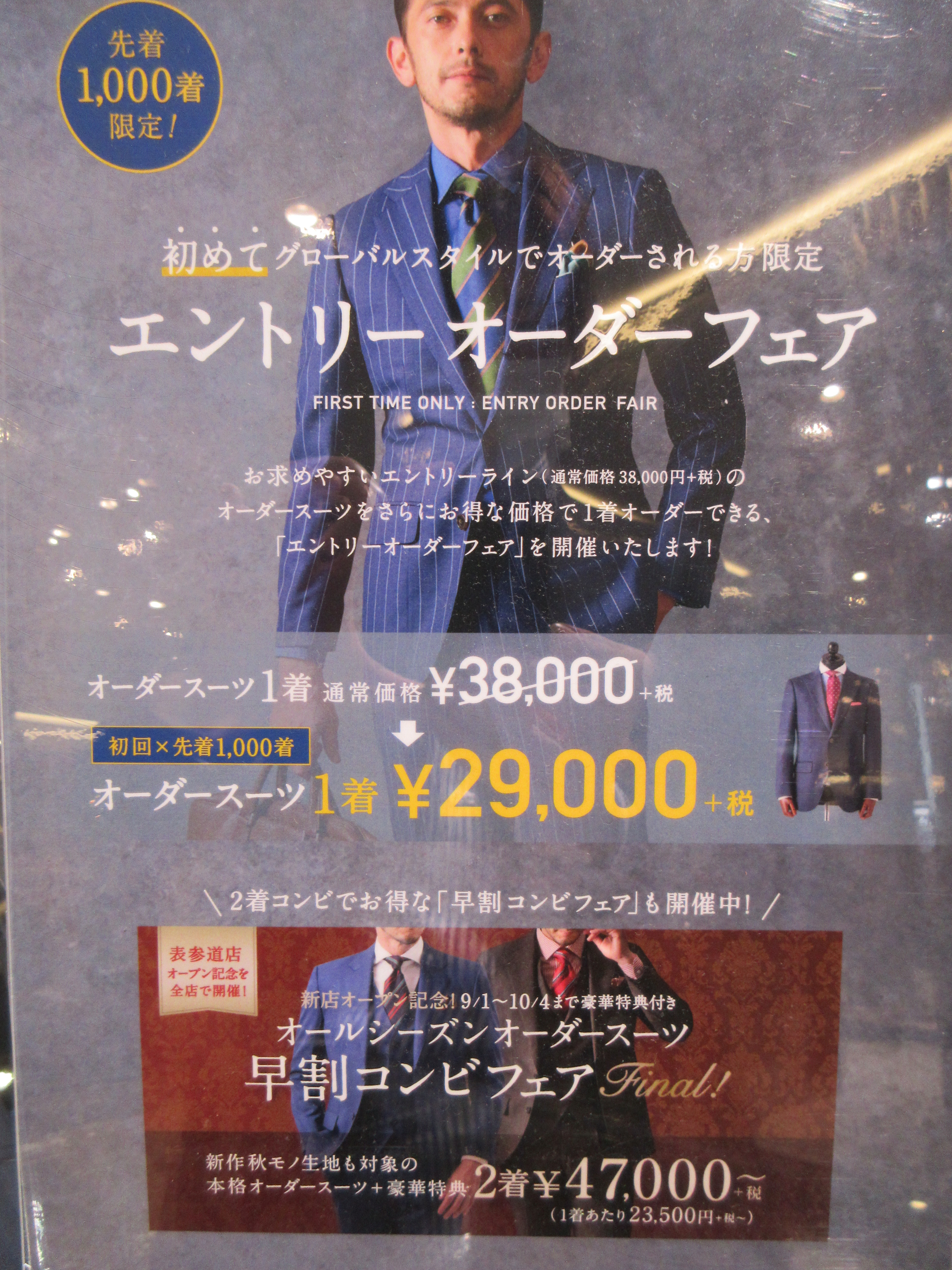 通常1着価格¥38,000円+税の生地が1着で¥29,000円+税でご案内