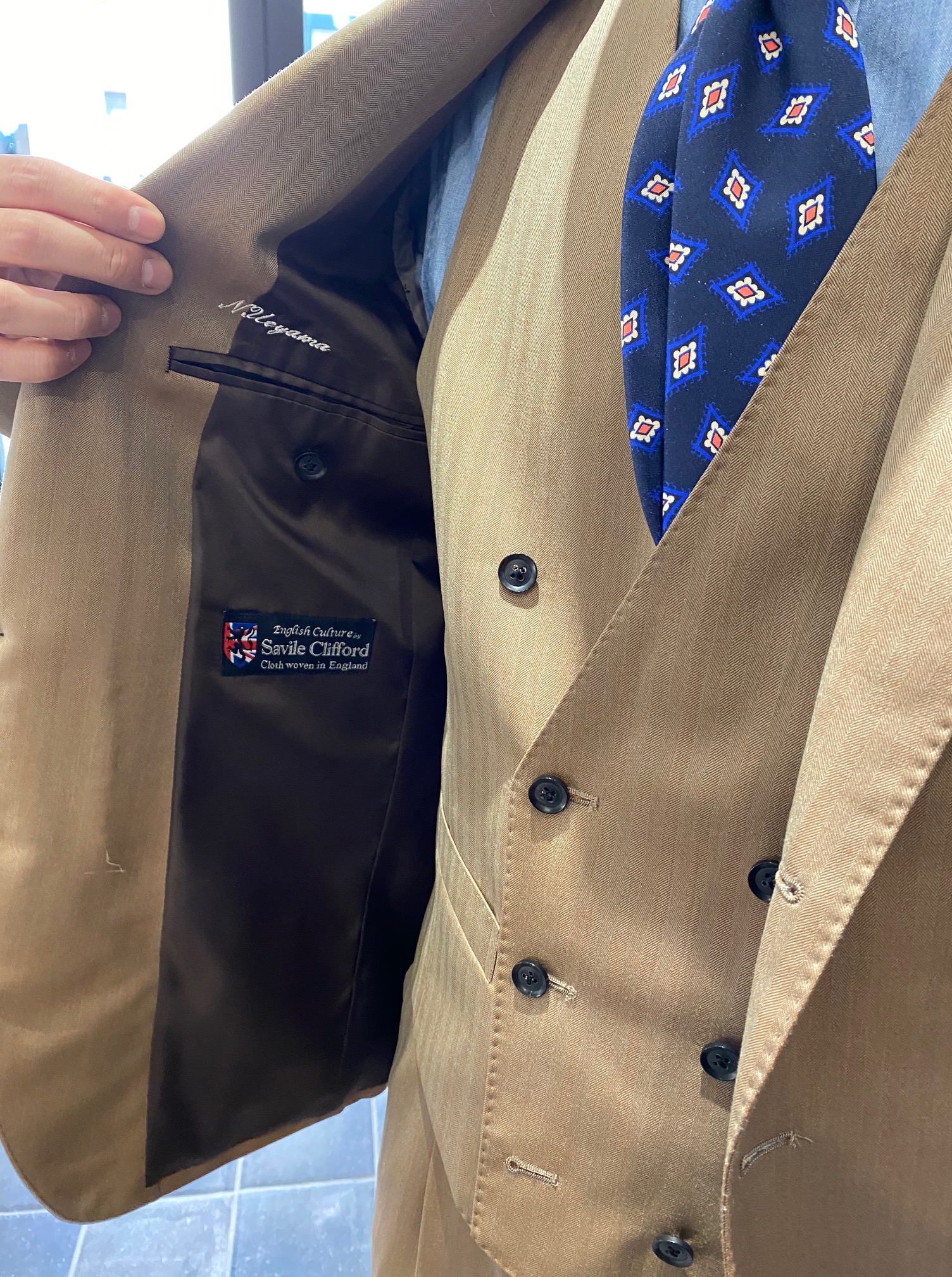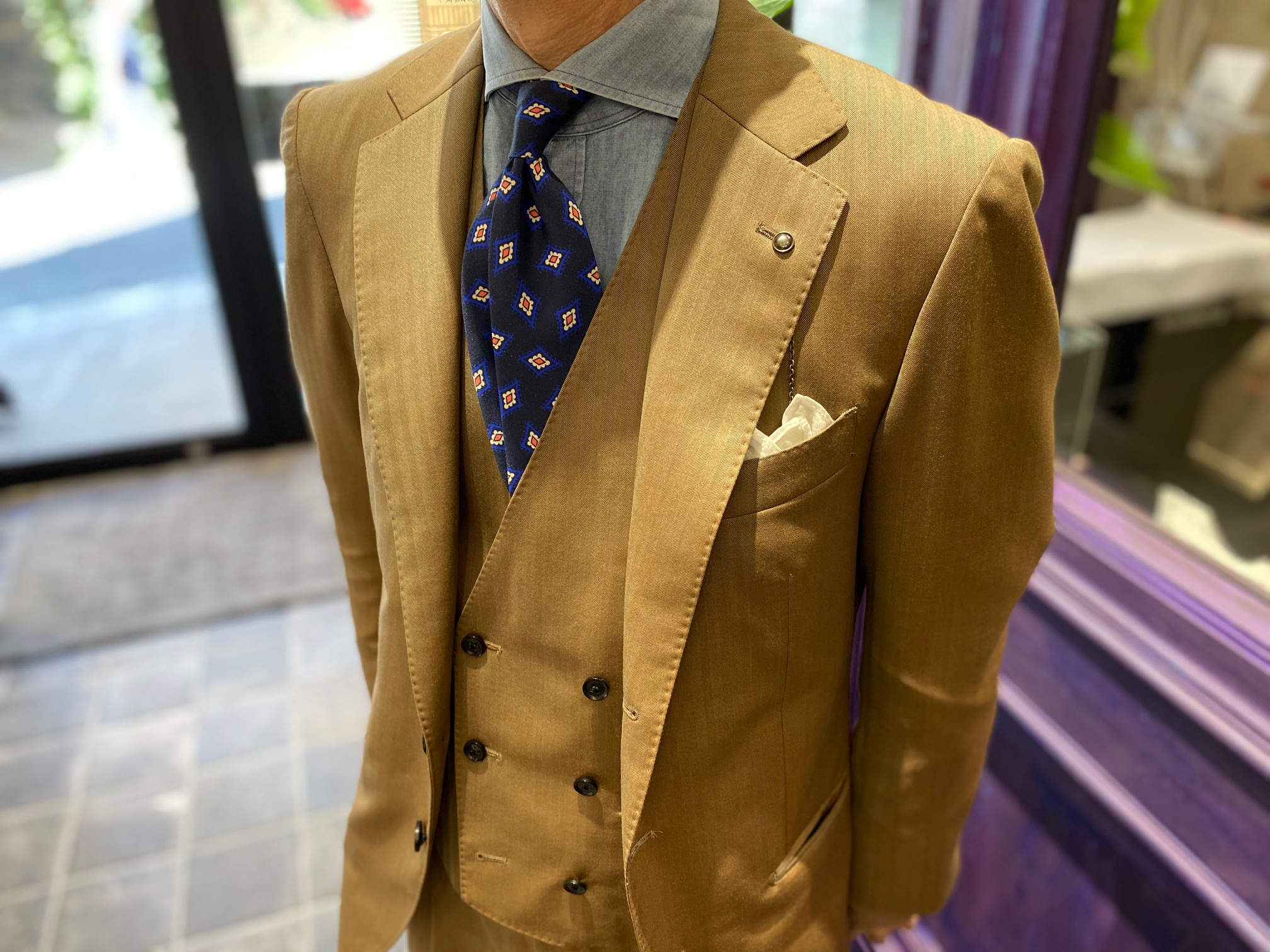 生地も清涼感のあるベージュスーツなのでベストを着用していても重くなりすぎない印象です