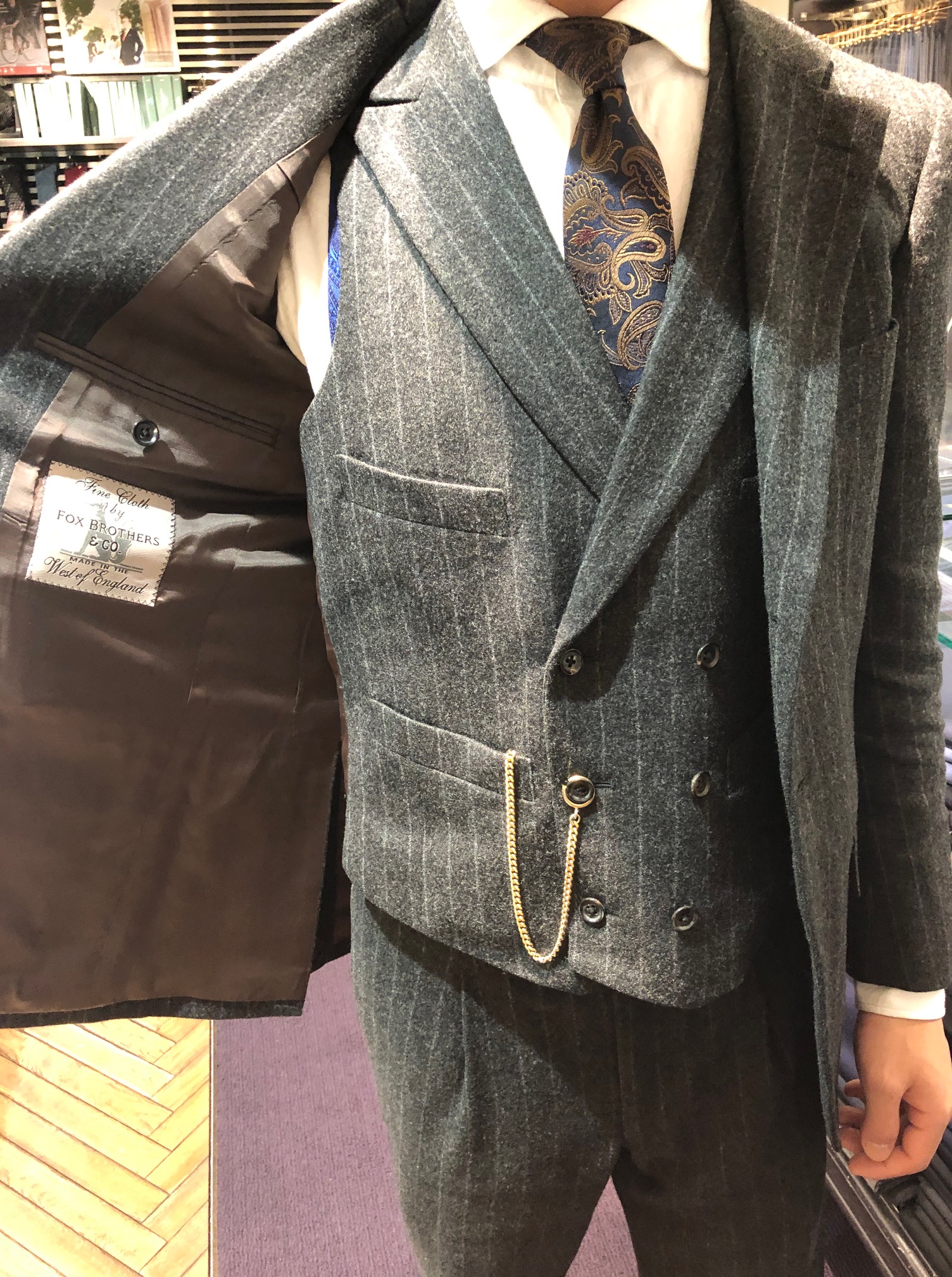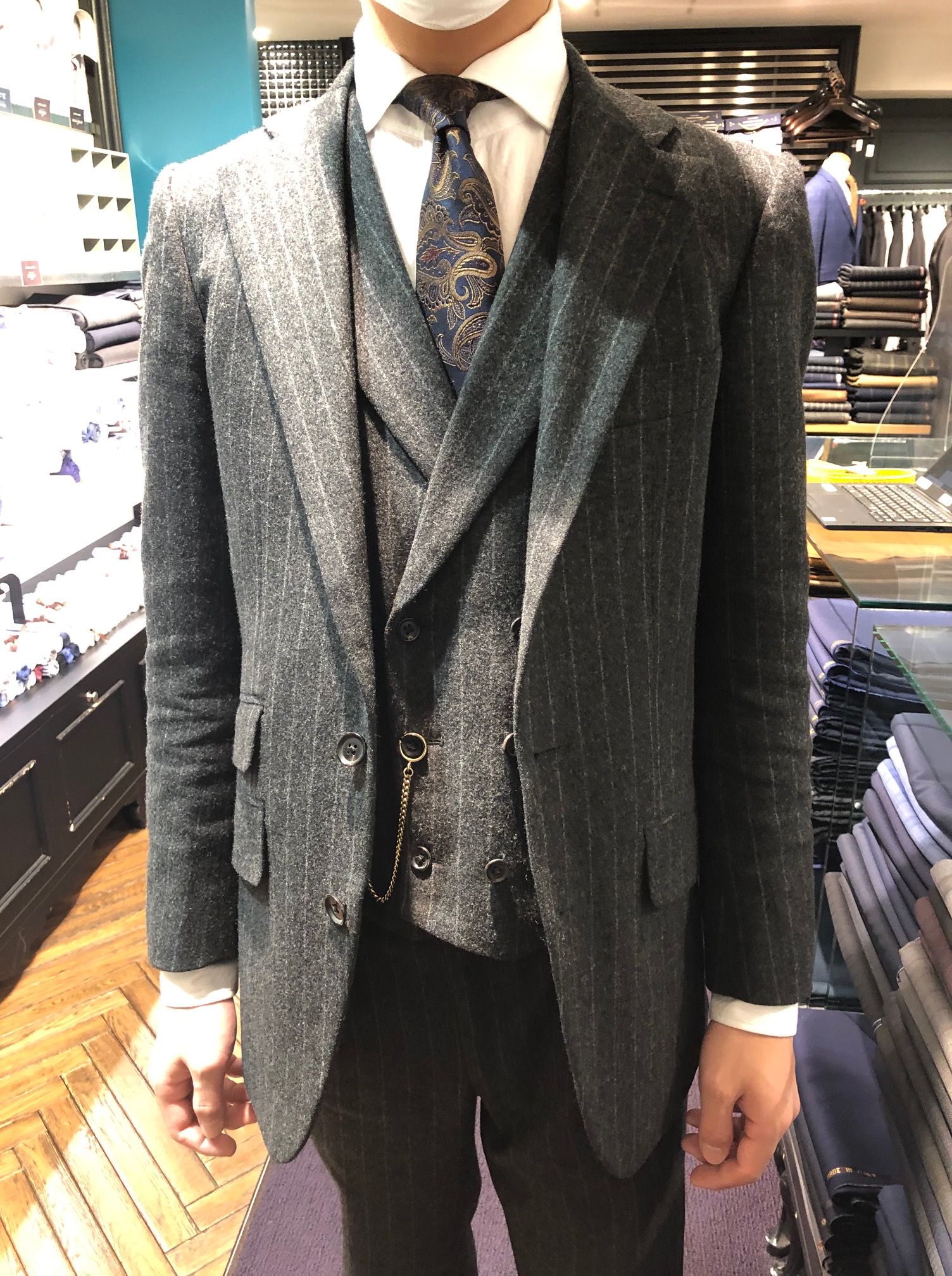 本日はスタッフ井上のフランネルスーツのコーディネイトを先ず。