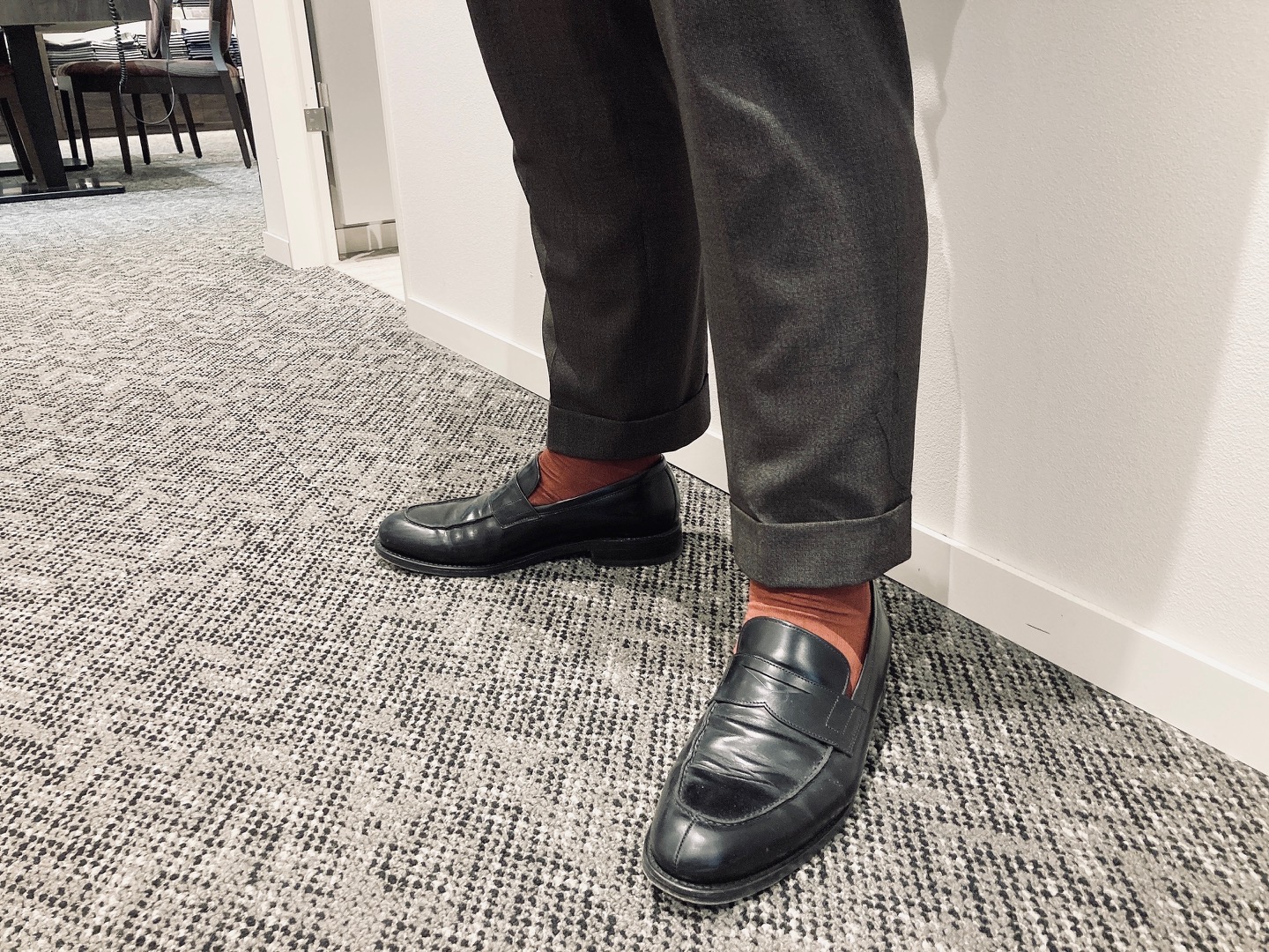 ブラウンのスラックスから除くブリックカラーの靴下が