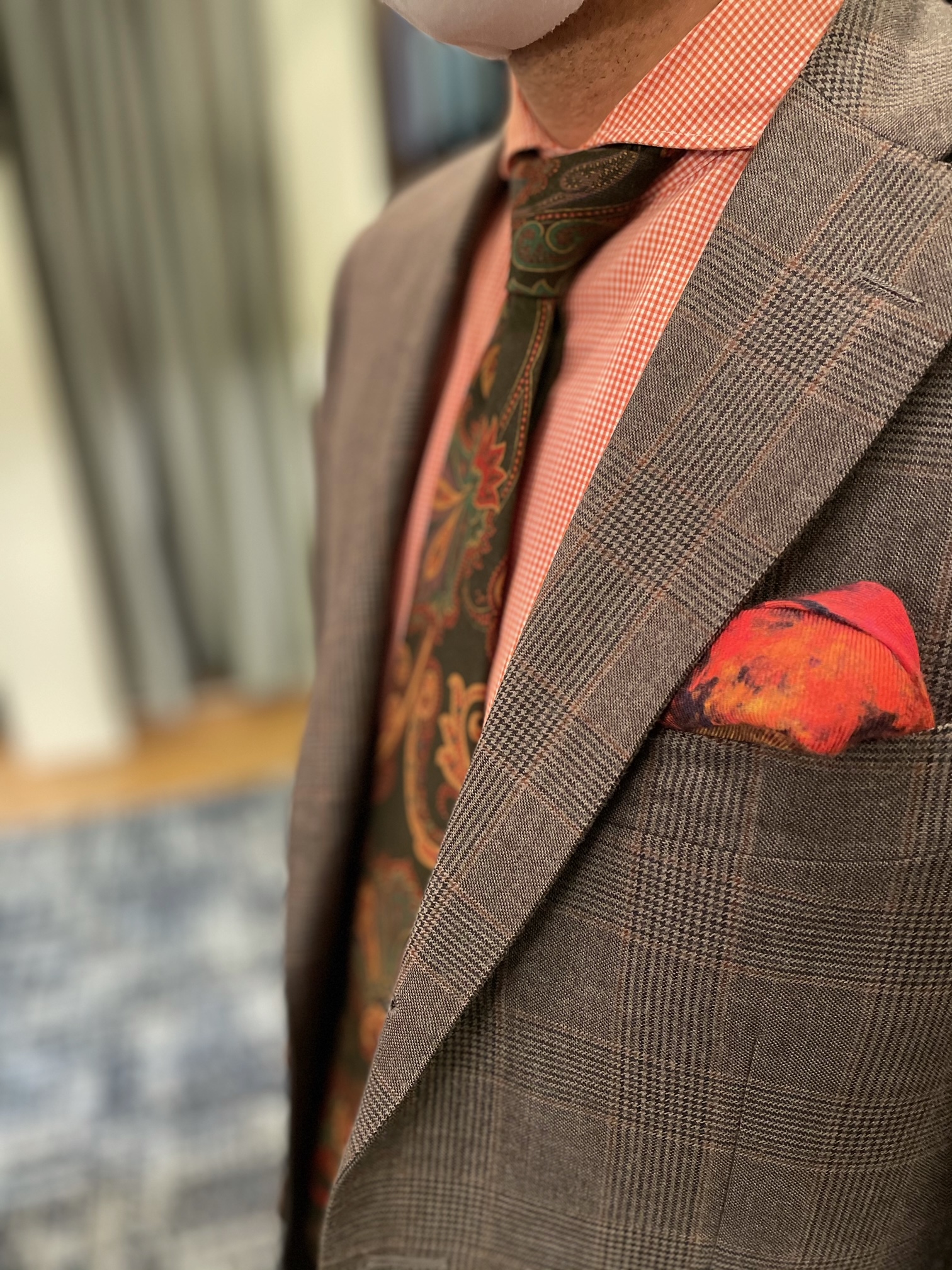 暖色でシャツ・チーフを合わせる事で、冬らしい
