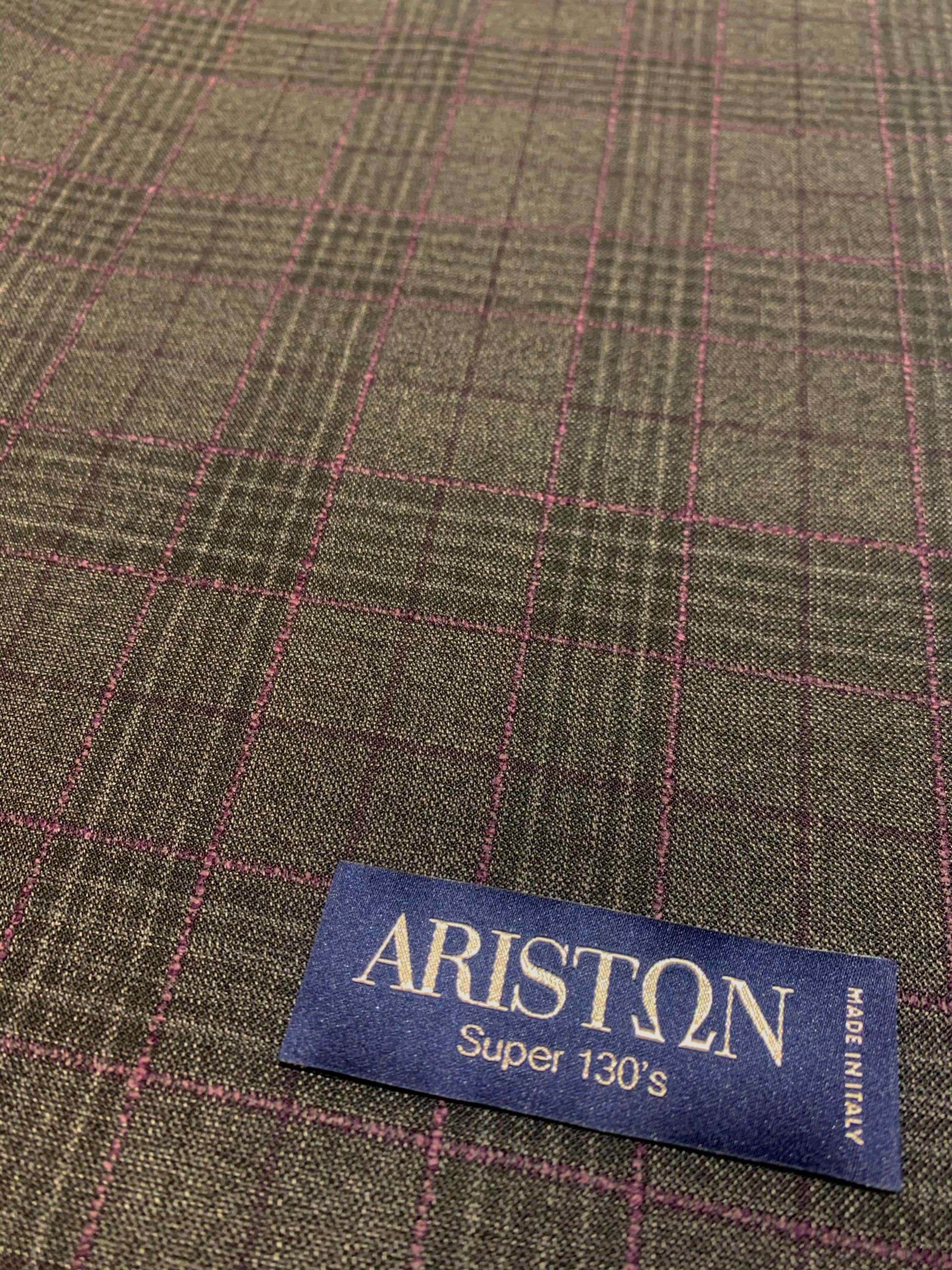 生地の色を広い、紫色のネクタイやチーフと合わせたら