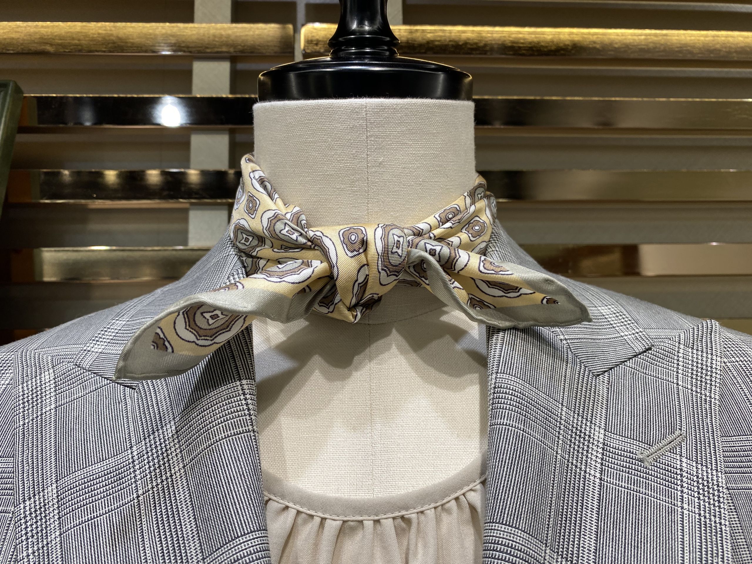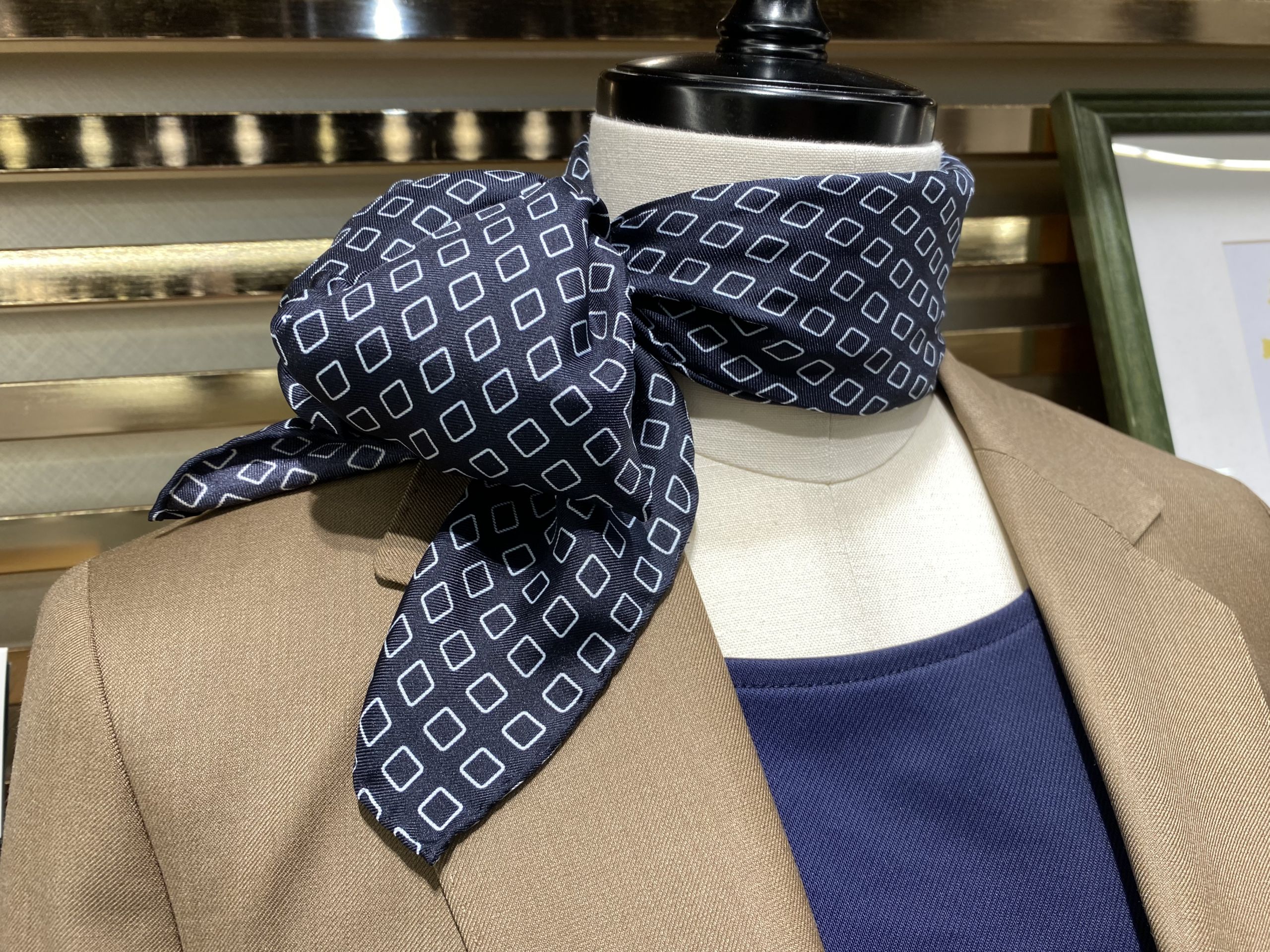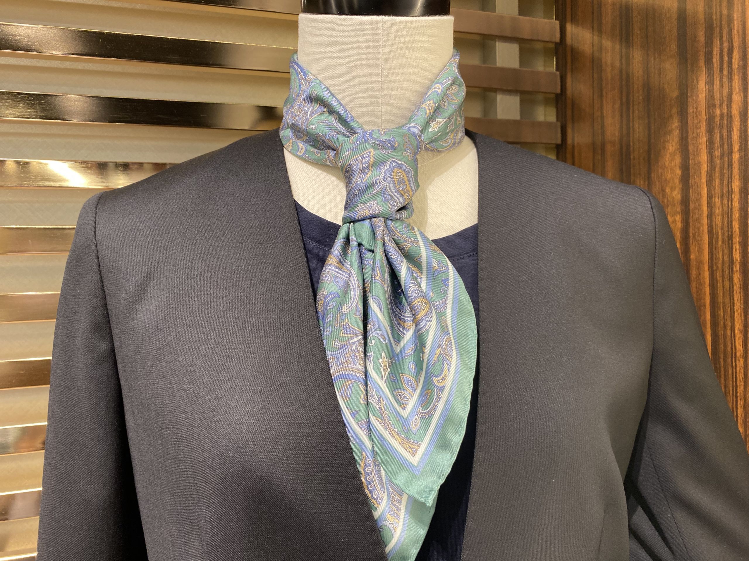顔回りを華やかな印象にしてくれる スカーフ のご紹介です。