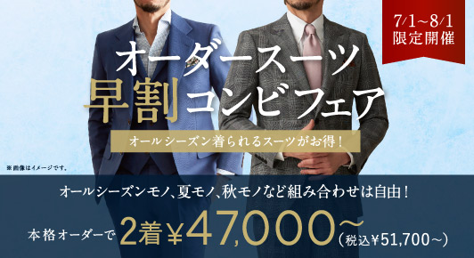 さらに!8月1日までの期間限定で早割オーダースーツコンビフェアを開催中です。