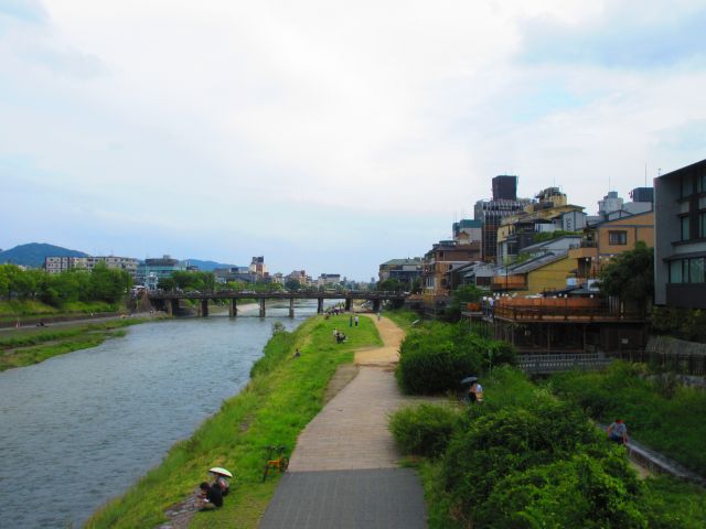 まずは御池大橋からの景色。写真奥に映る如何にもな橋が東海道の起点にして終点の三条大橋です。