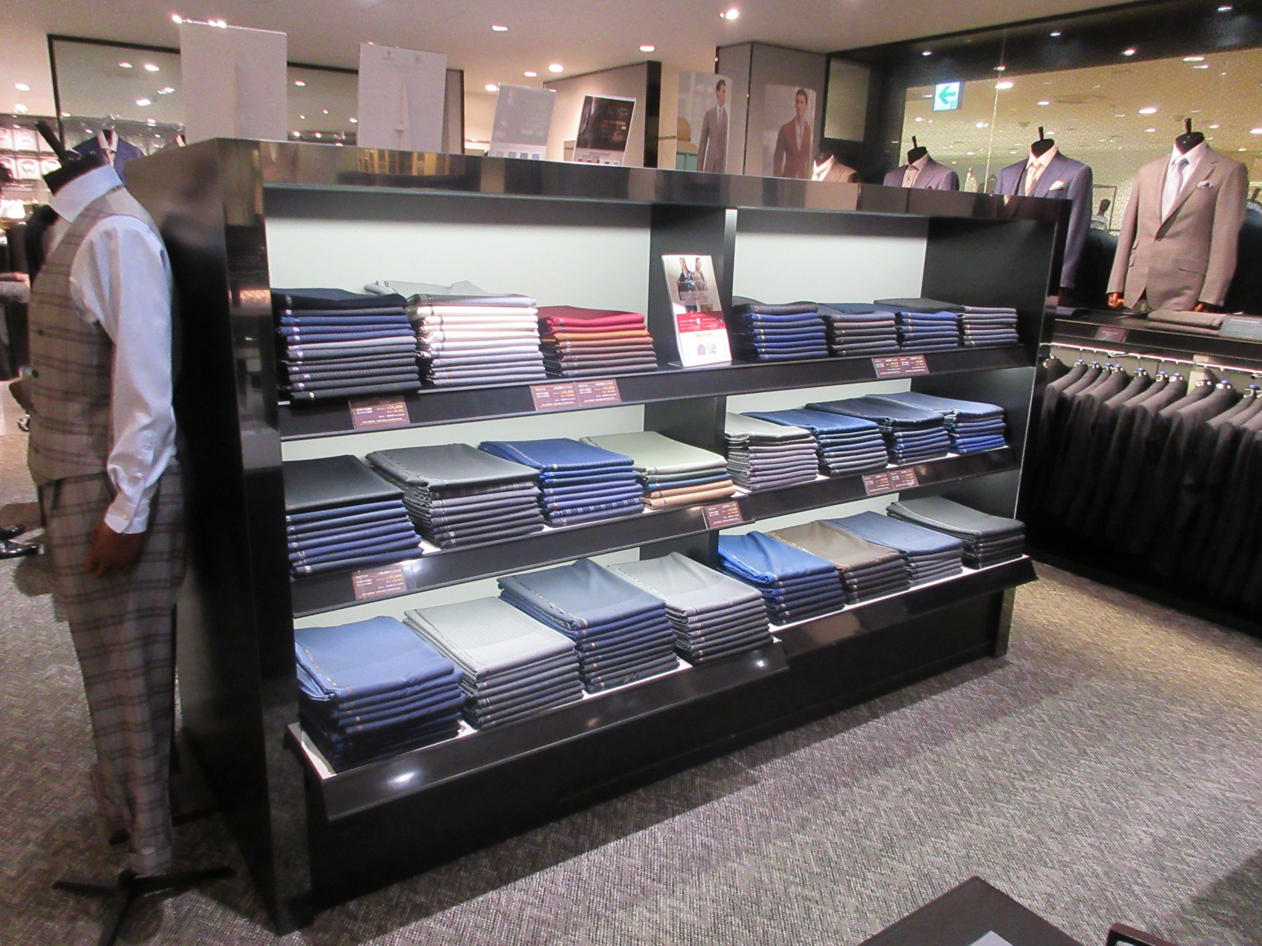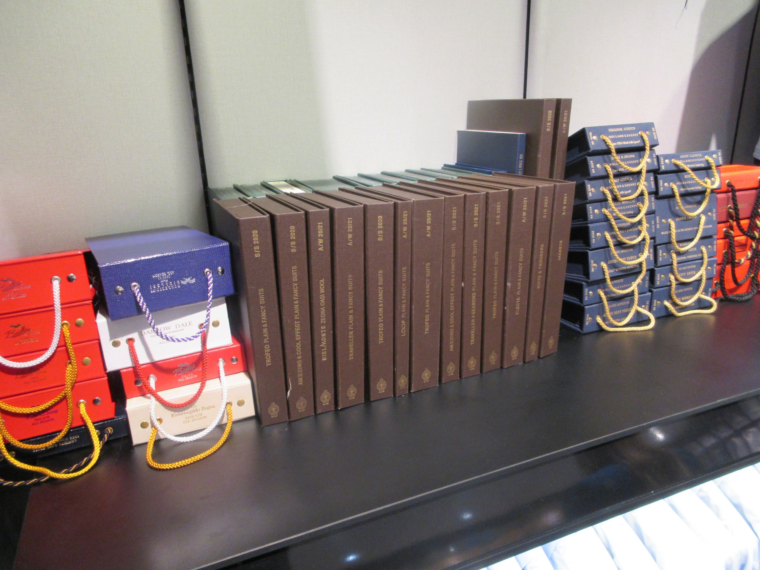 スーツ作りの流れとしましては採寸の後、お好みの生地をお選びいただきます。大きい反物でご準備はあるので