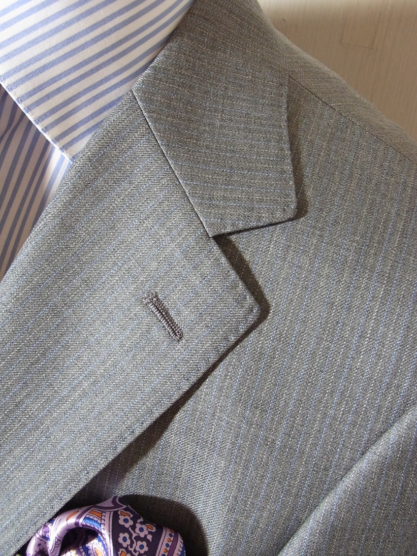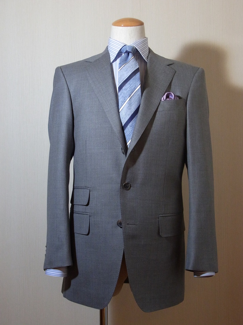 さて本日はライトグレーのダンヒルの生地で仕立てたスーツをご紹介致します。