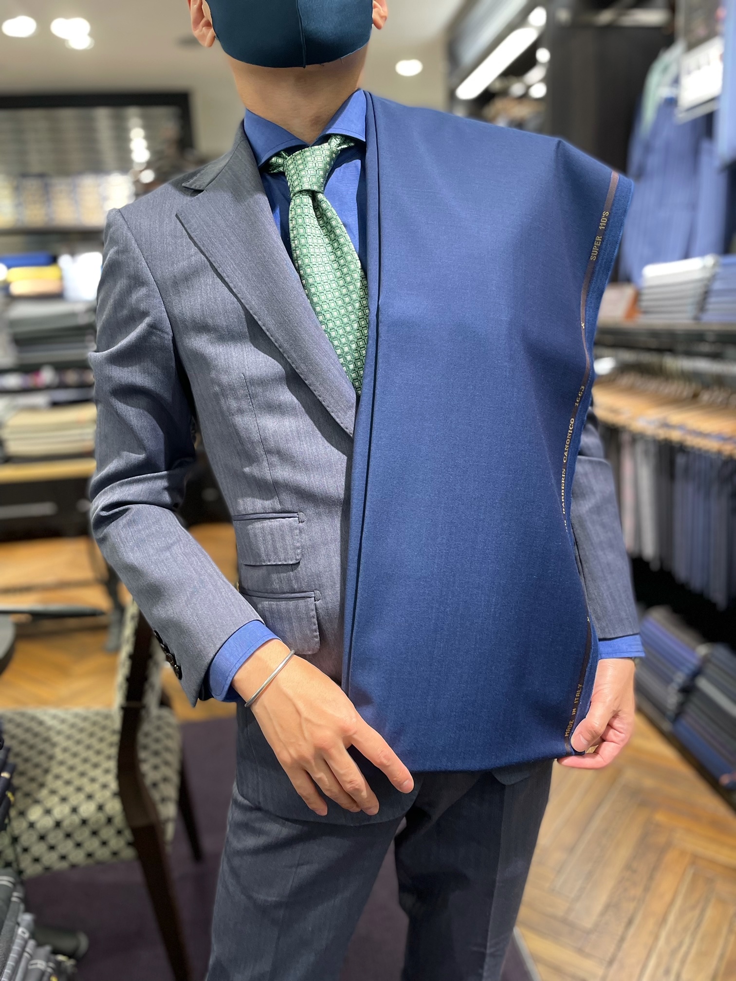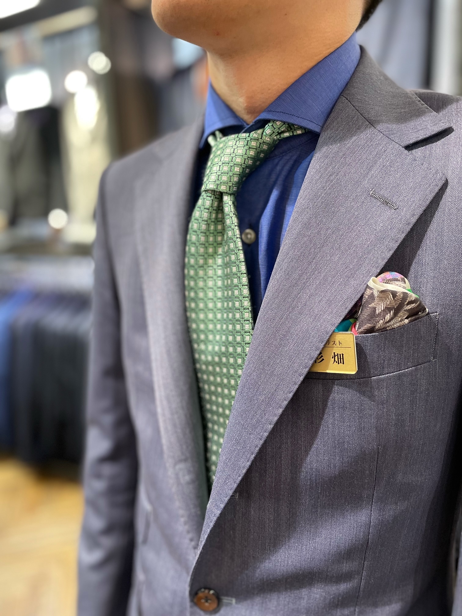 グレーの色も入っているので、派手過ぎないスーツの色味が好きだそうです。