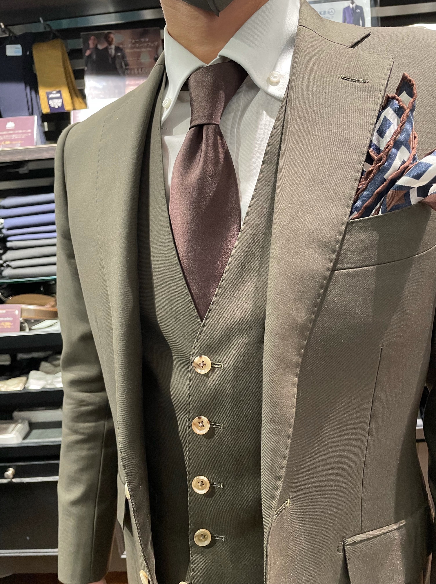 カーキ系のスーツも派手すぎるわけではなく普段のスーツスタイルと変化をとれるので