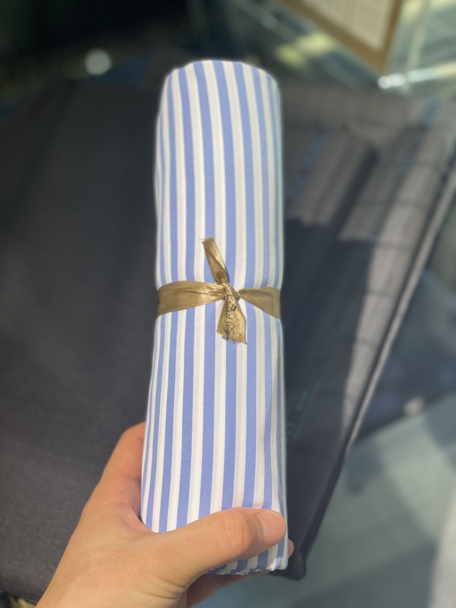 水色のロンドンストライプも「CANCLINI-カンクリーニ」の上品な生地感で高級感がありますね。