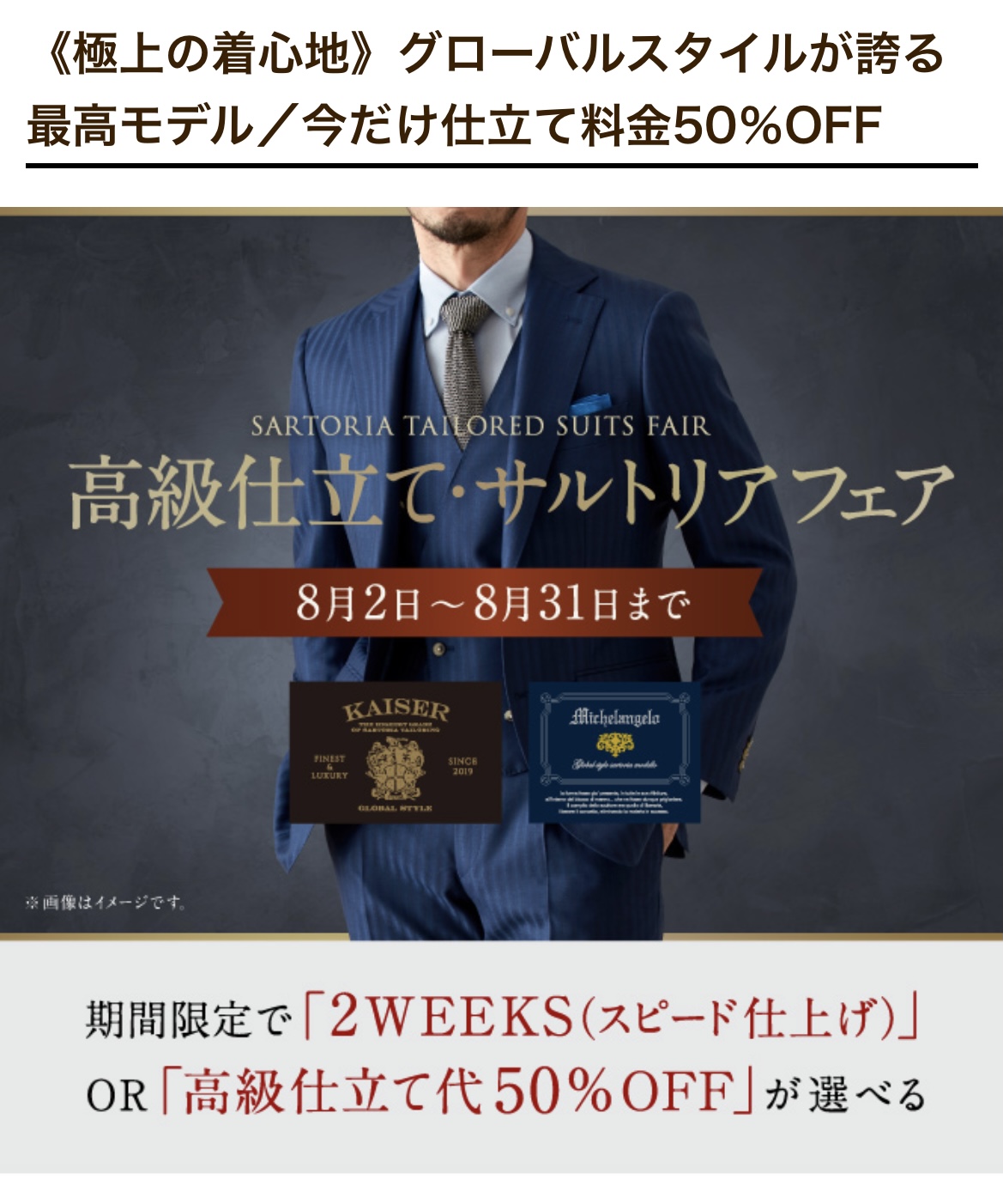 こちらのフェアでは、GlobalStyleが誇る、着心地、シルエット共に極上の高級モデル「サルトリア仕立て」を大変お得にお仕立ていただけます!!