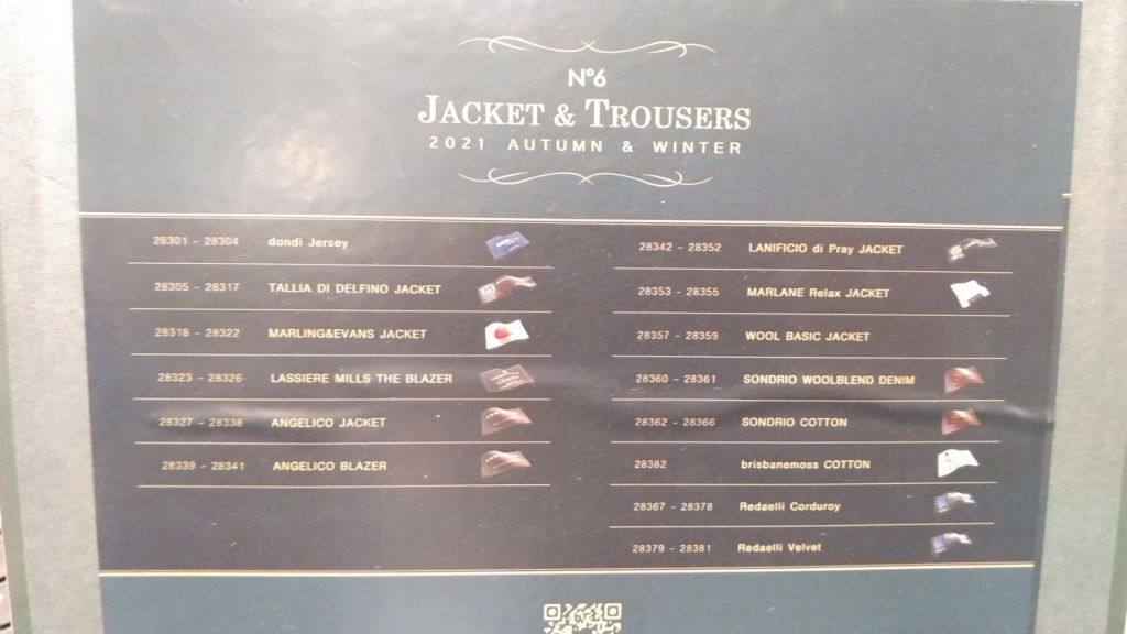 こちらは取引会社バンチコレクションのジャケットとスラックスメインで取り上げた生地を集約したものです。