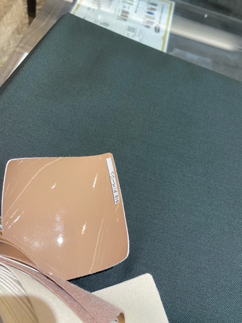 このような深いグリーンの生地でもピンクベージュと合わせるだけで柔らかい印象になります。