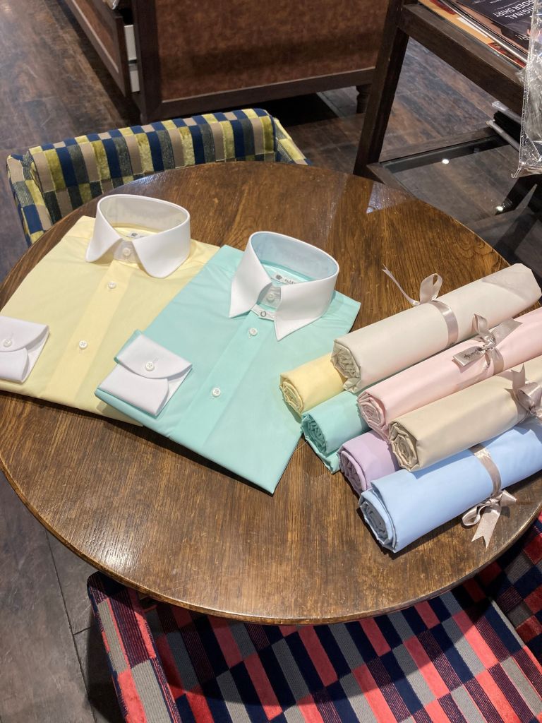 スーツ生地も明るいトーンも物が多い中で、「仕事柄派手なものは着れない」という方は是非シャツで取り入れて下さい。