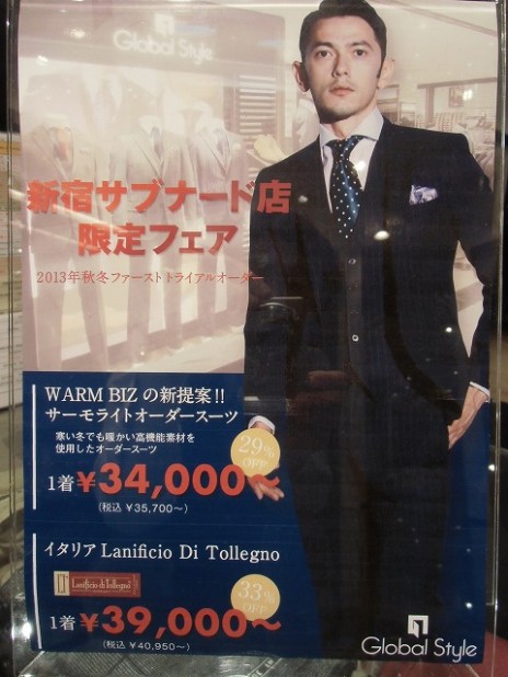 寒い時期に暖かさをキープしてくれる機能素材「サーモライト」の生地を使って仕立てるスーツが1着¥34,000(税抜)