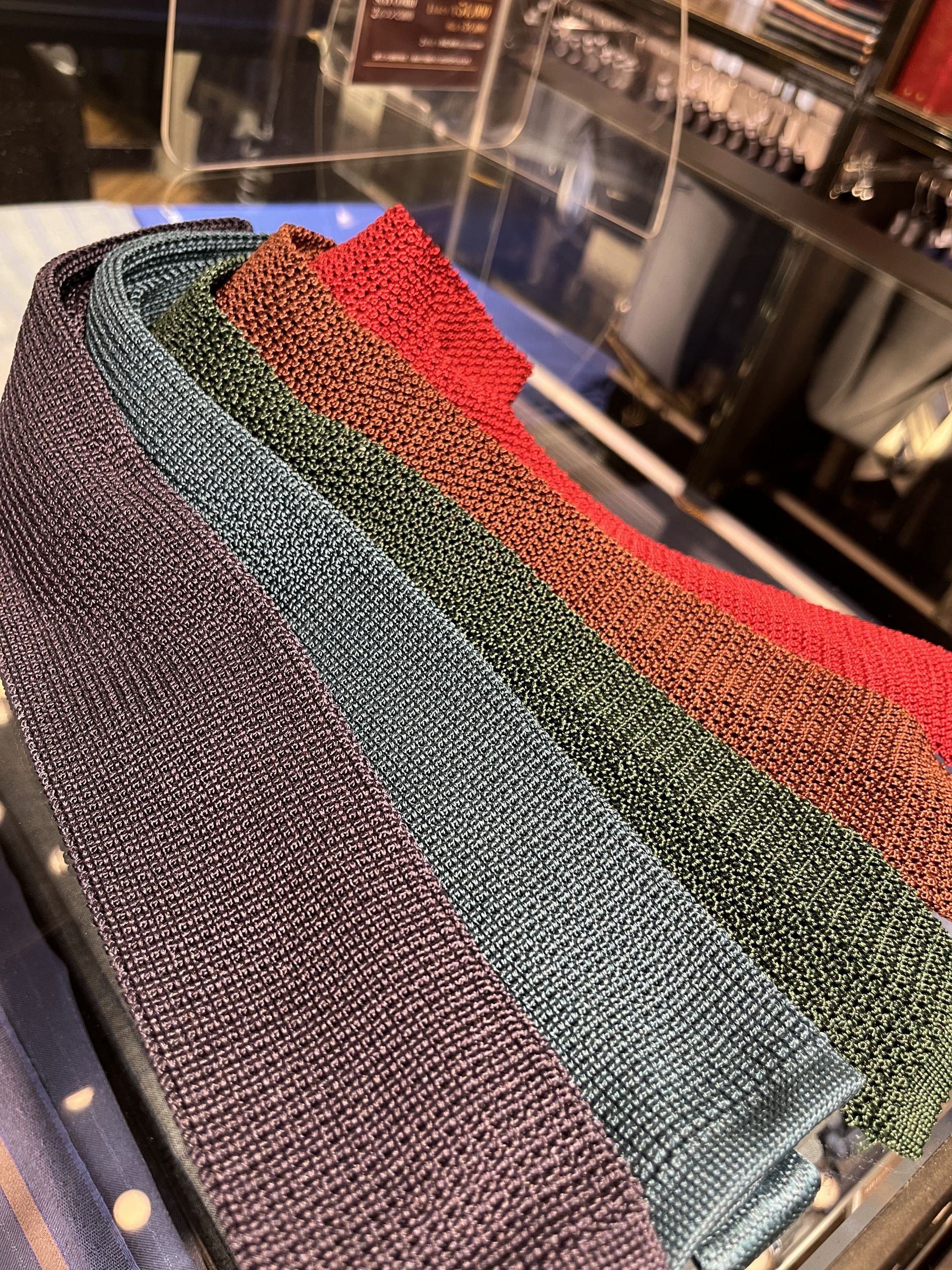ニットタイになります。その名の通り編んだ生地で作られたネクタイ