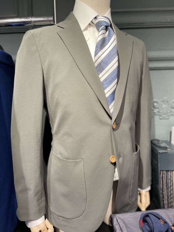 定番ブルースーツやグレースーツなどにこのようなグリーン・カーキのネクタイを