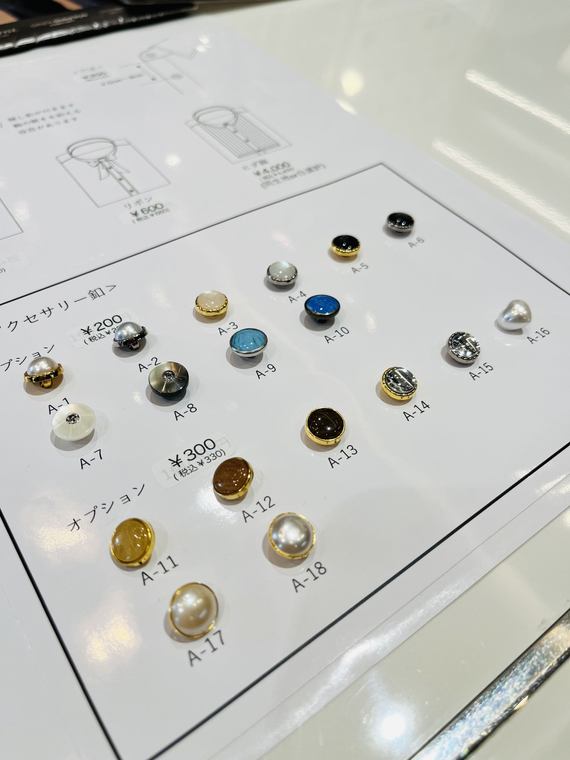 第一ボタンと袖口のボタンにワンポイントでアクセサリーのボタンをつけているお客様もいらっしゃいます。