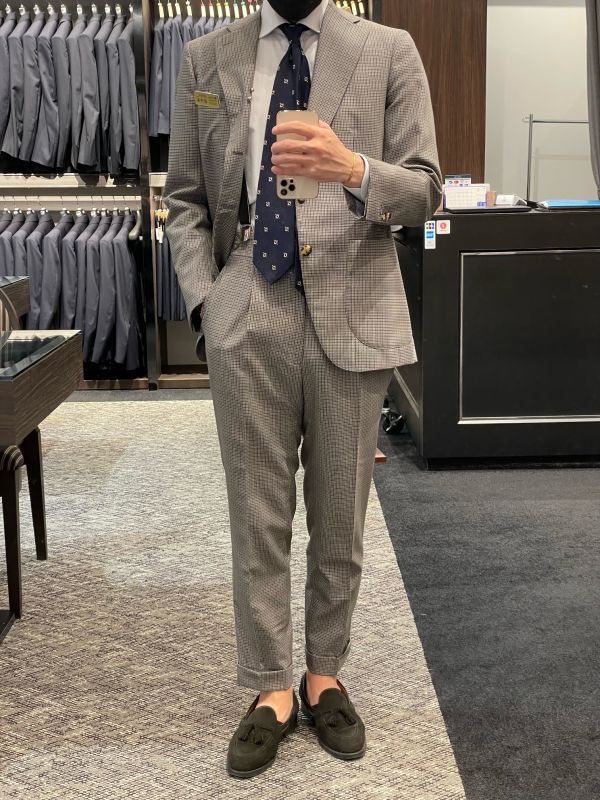 色味はグレーベースのブラック×ブラウンのマイクロチェックのような柄となっております。