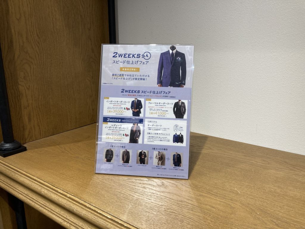 オーダースーツで2週間のお仕上がりをご予定しておりますので急なご予定がある場合にぜひお役立てください。