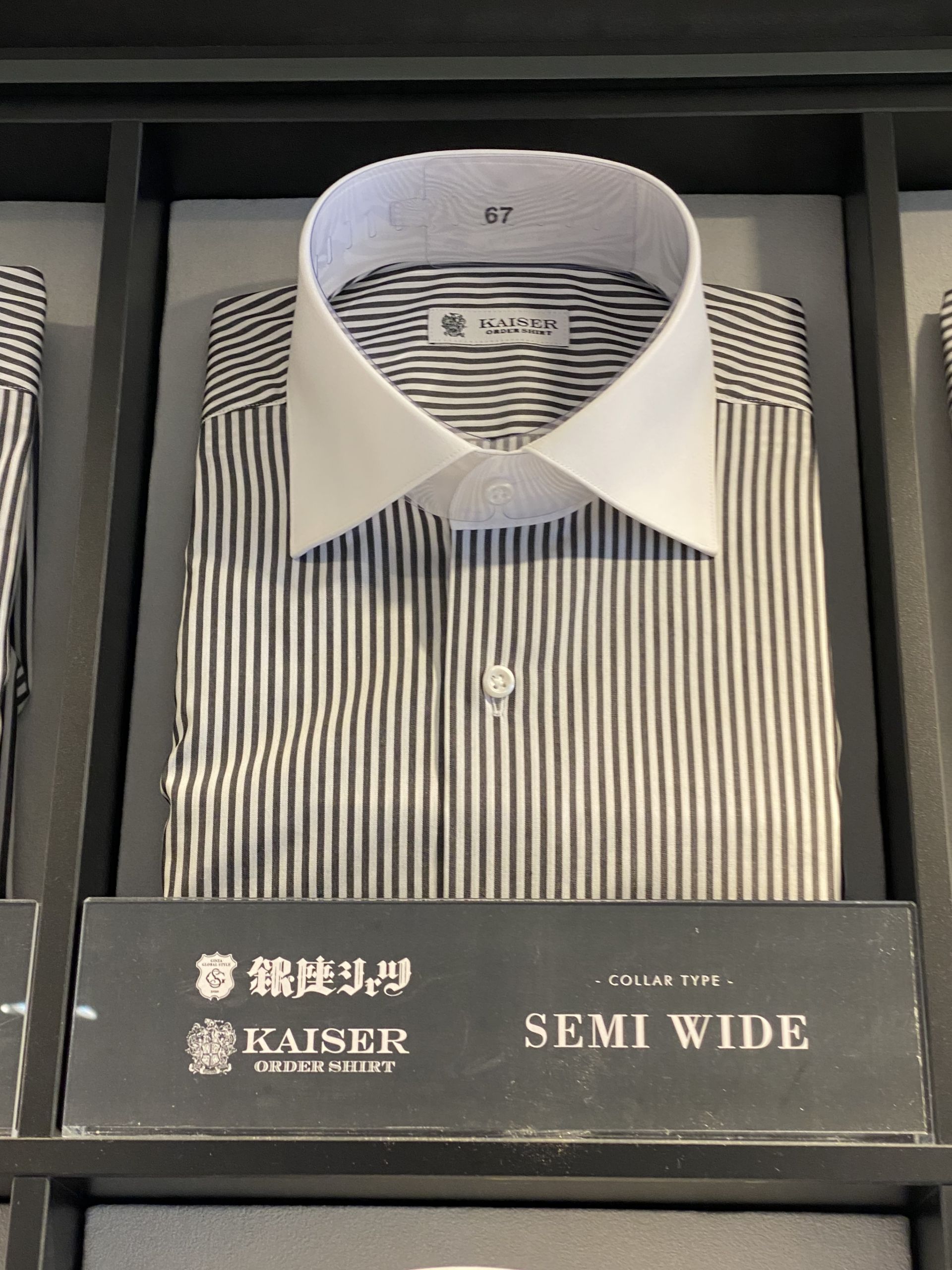 襟の長さや開きがスタンダードとなり、様々なジャケットやネクタイに合わせやすいです。