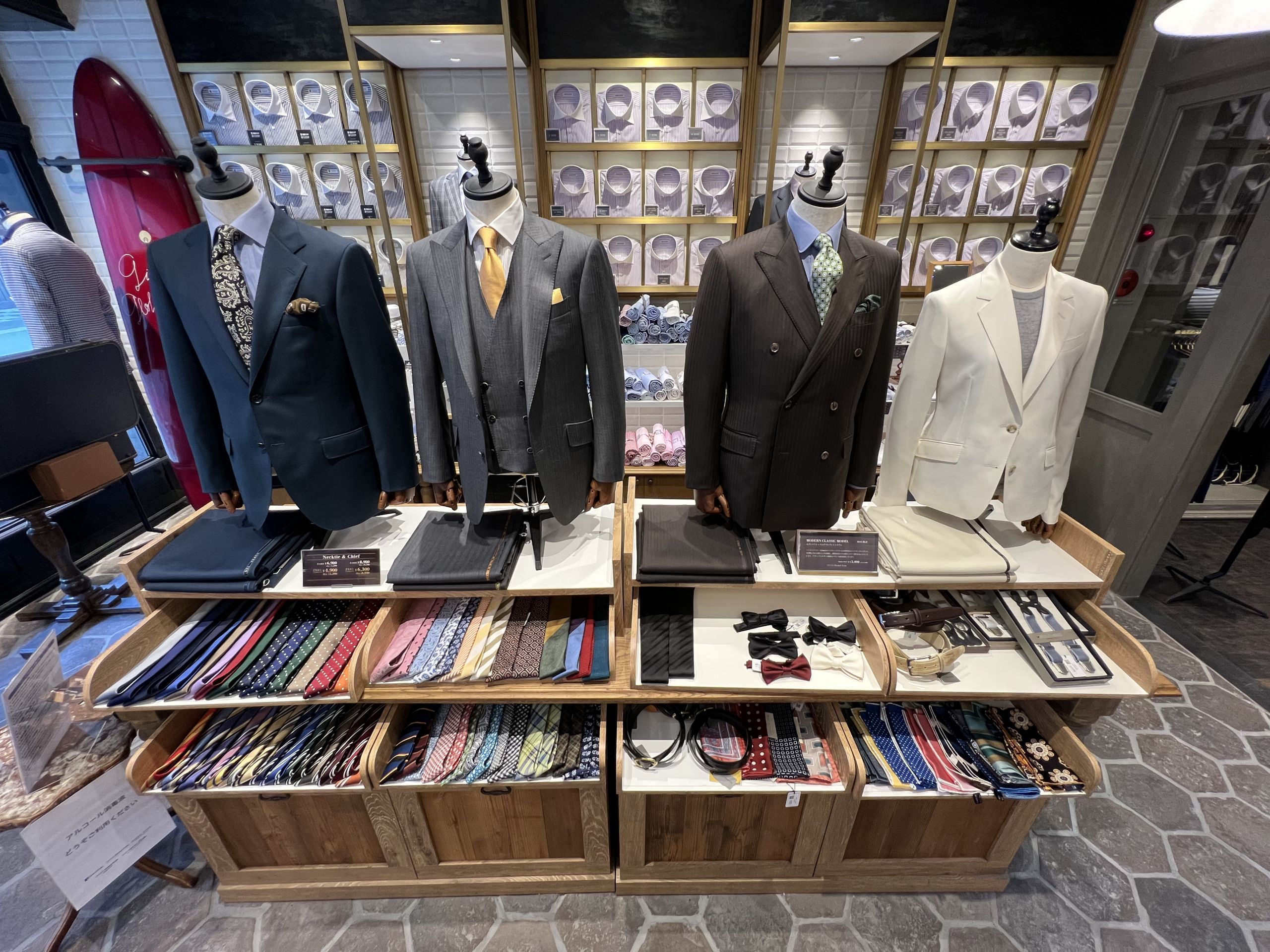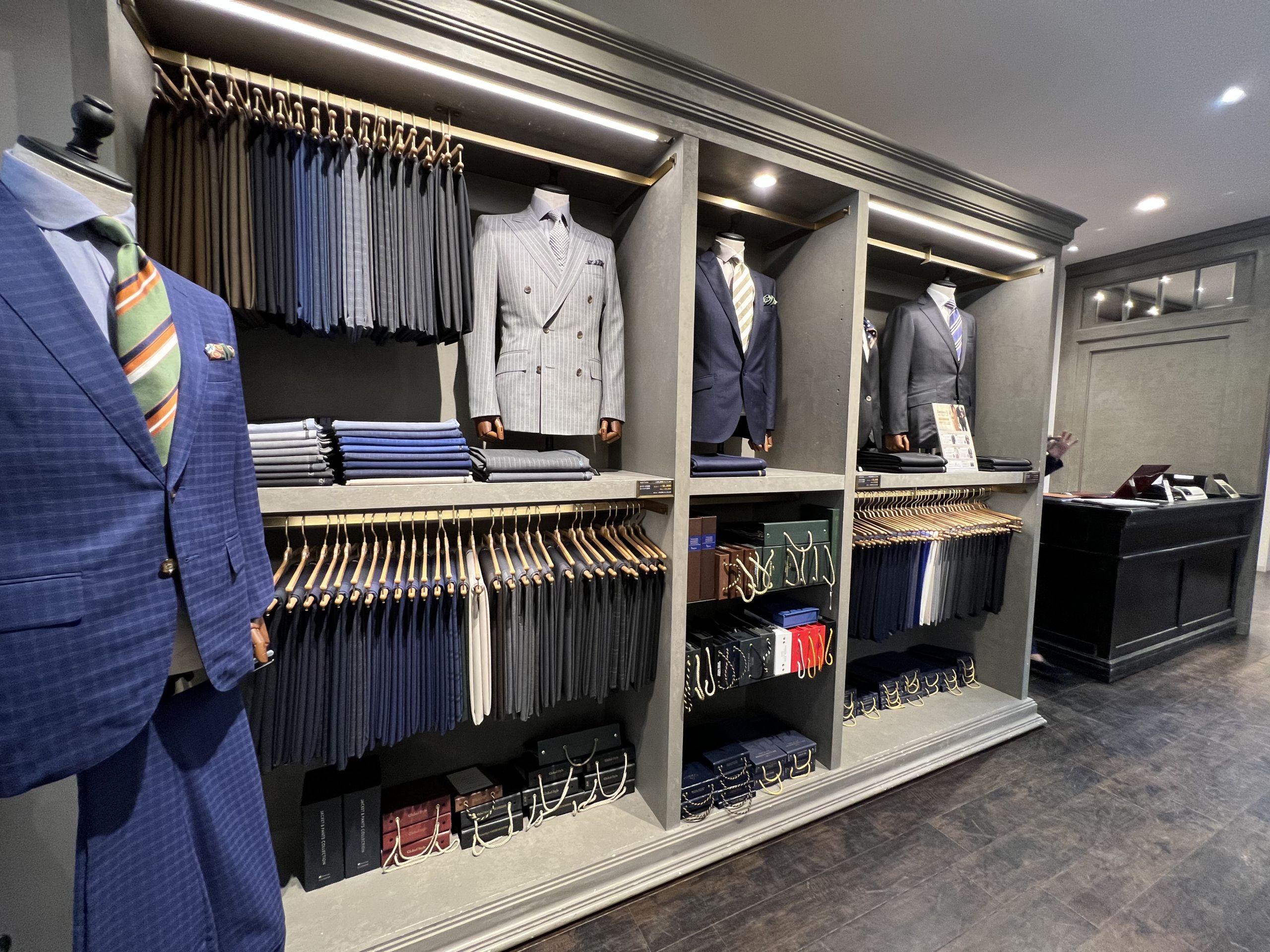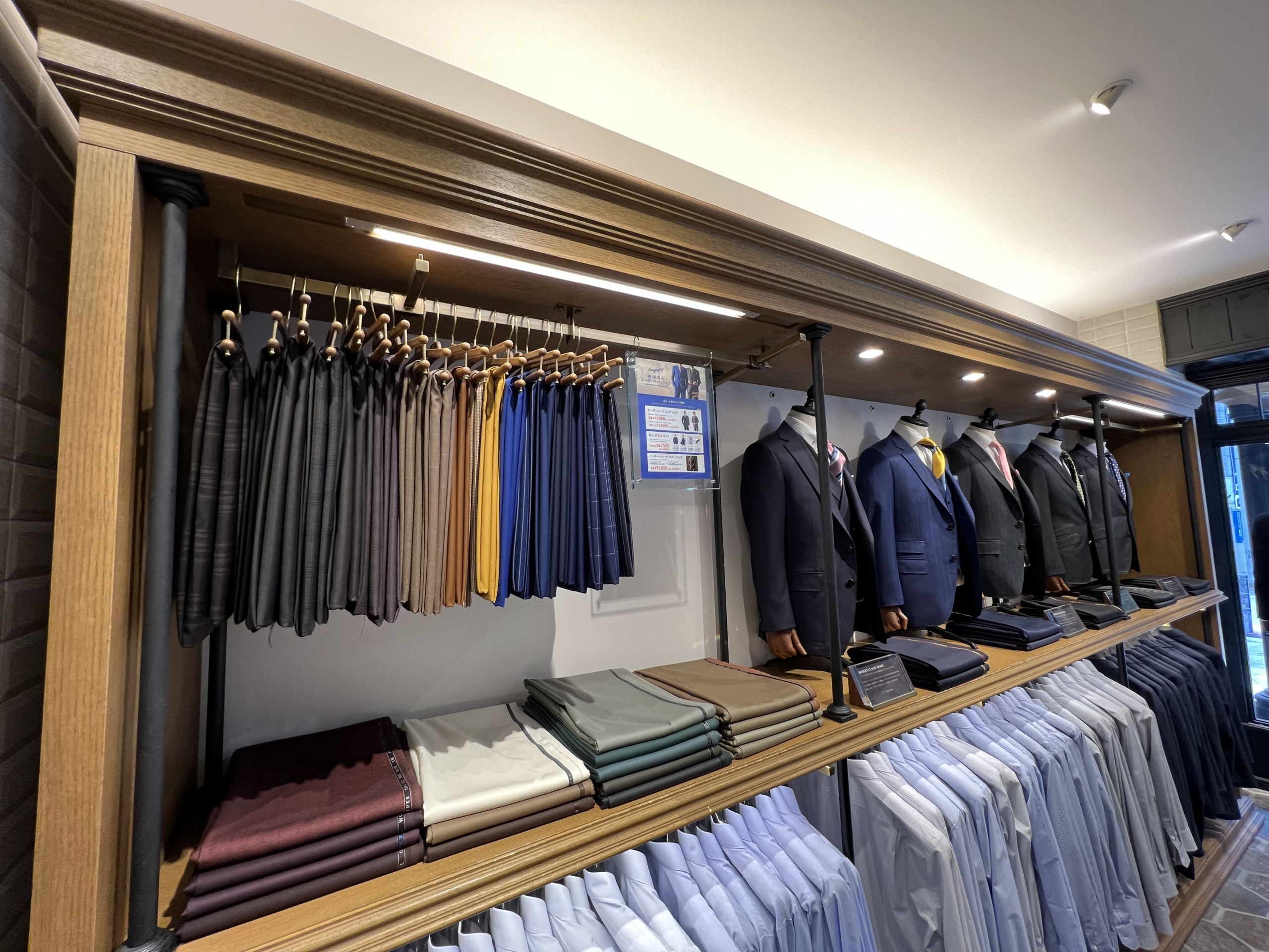 シャツブースのすぐ横には春夏用スーツ、スピード仕立ての生地になります。