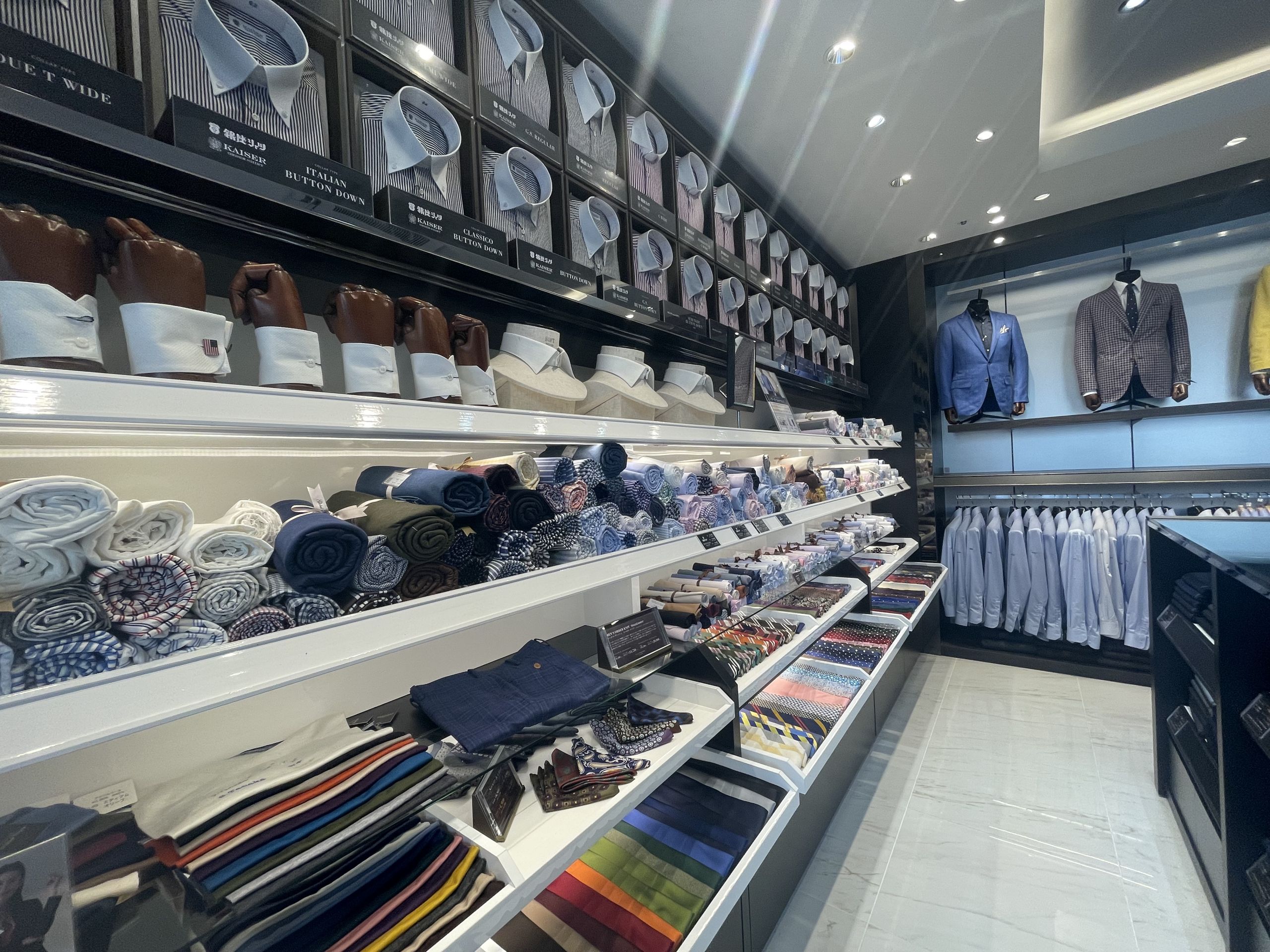 横浜西口店では入ってすぐ左側にシャツ生地、ネクタイ・チーフなどが置いてあります