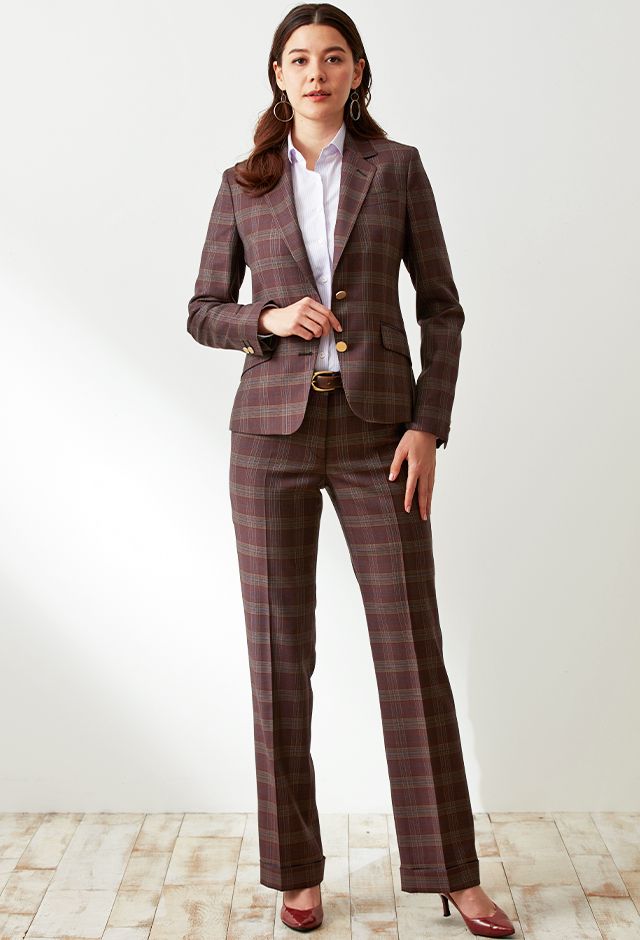 スーツ生地が濃い赤色なので、インナーとパンプスを明るいピンクでまとめました。