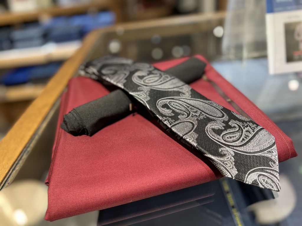 赤色のスーツの華やかさと黒シャツ、黒ネクタイの重量感が組み合わせていることでゴージャスなイメージになります。
