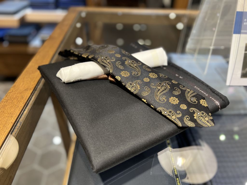 スーツ自体は黒スーツに白シャツといたって普通ですが、ネクタイにゴールドが入っておりとっても豪華になります!