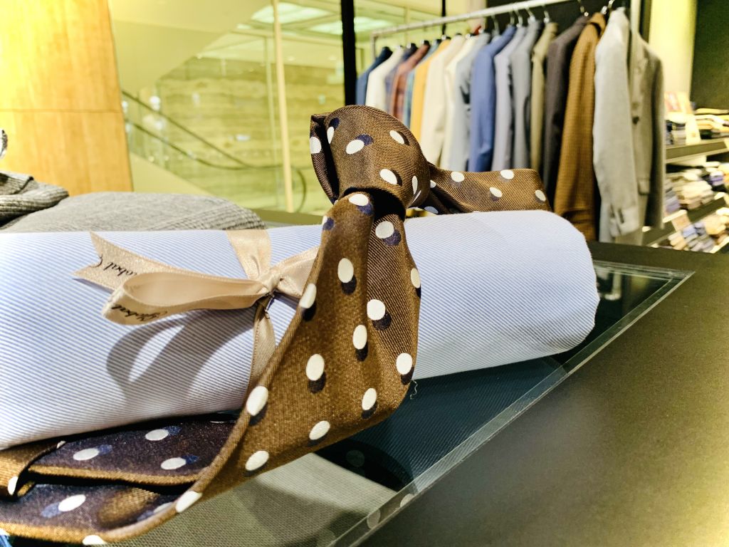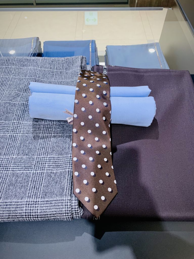 タイはブラウン×ホワイト、ダークネイビーのドット柄タイを。