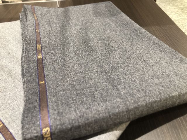 一見シンプルなグレーの無地のスーツですが起毛しているので暖かな風合いがあります。