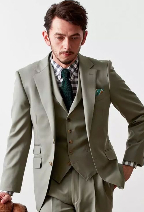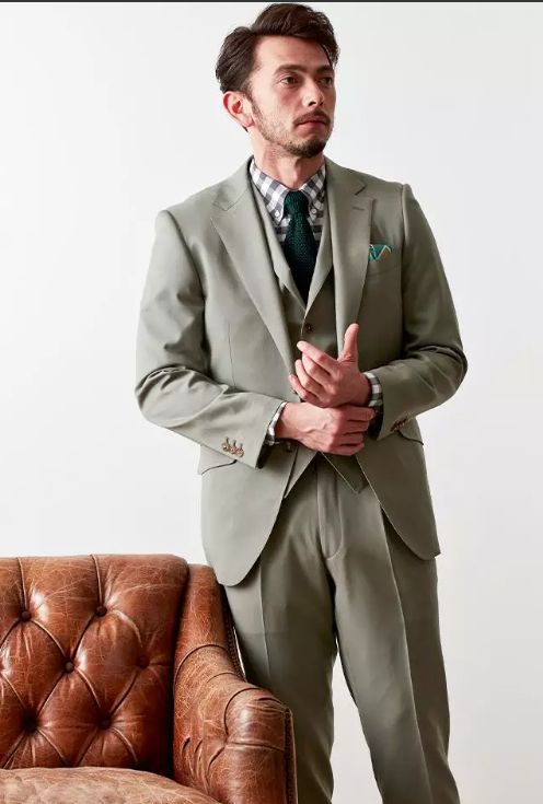 優しい雰囲気で、お洒落度がぐーんと高く見えるグリーンスーツ、