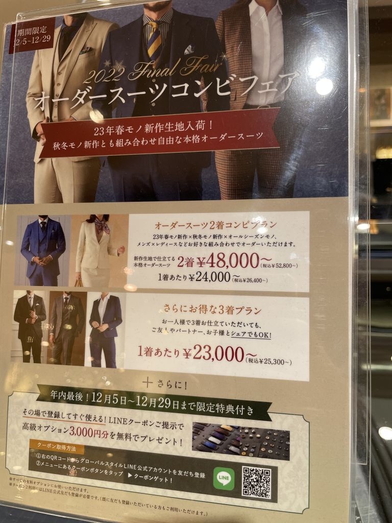 まずグローバルスタイルでは複数着買いで安くお仕立て頂けますが