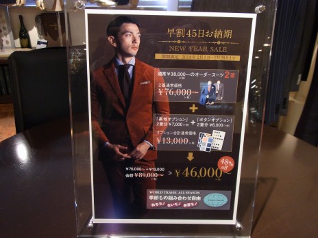 ¥1,000(税抜)の割引きと、釦、裏地を一着あたり¥6,500まで無料 で
