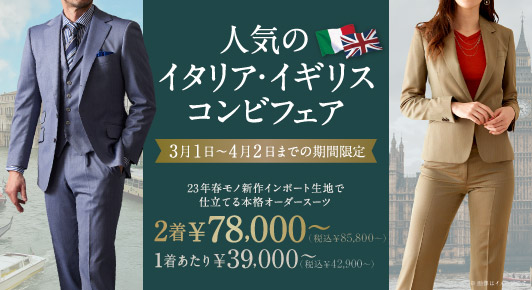 プライベート用とビジネス用の二着欲しい。そういったお客様にぜひご活用していただきたいのがイタリア・イギリスコンビフェアとなっております。