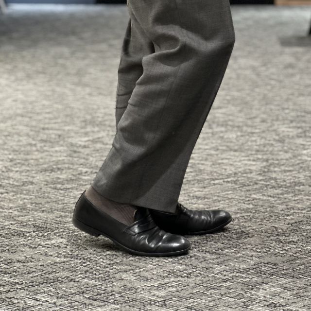 足元は黒のローファーで、ソックスを黒にすると激重になるので