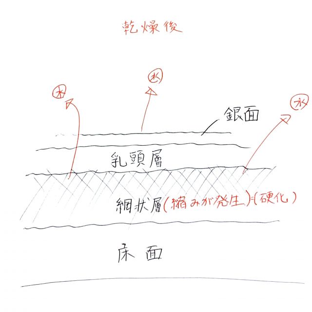 油分が抜け水分も蒸発した「網状層」は収縮してカチコチに固まってしまい、曲げなどのテンションがかかることでひび割れてしまいます。