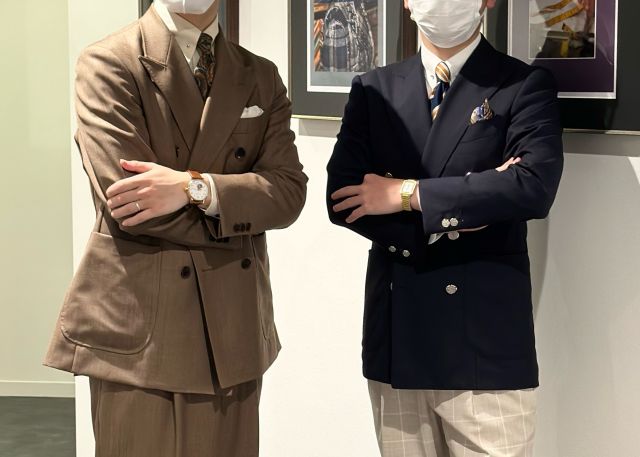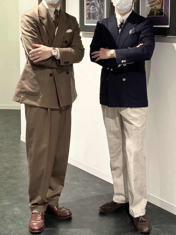 という事で今回は、満原副店長と僕のダブルブレストを使ったコーディネート紹介でございます。
