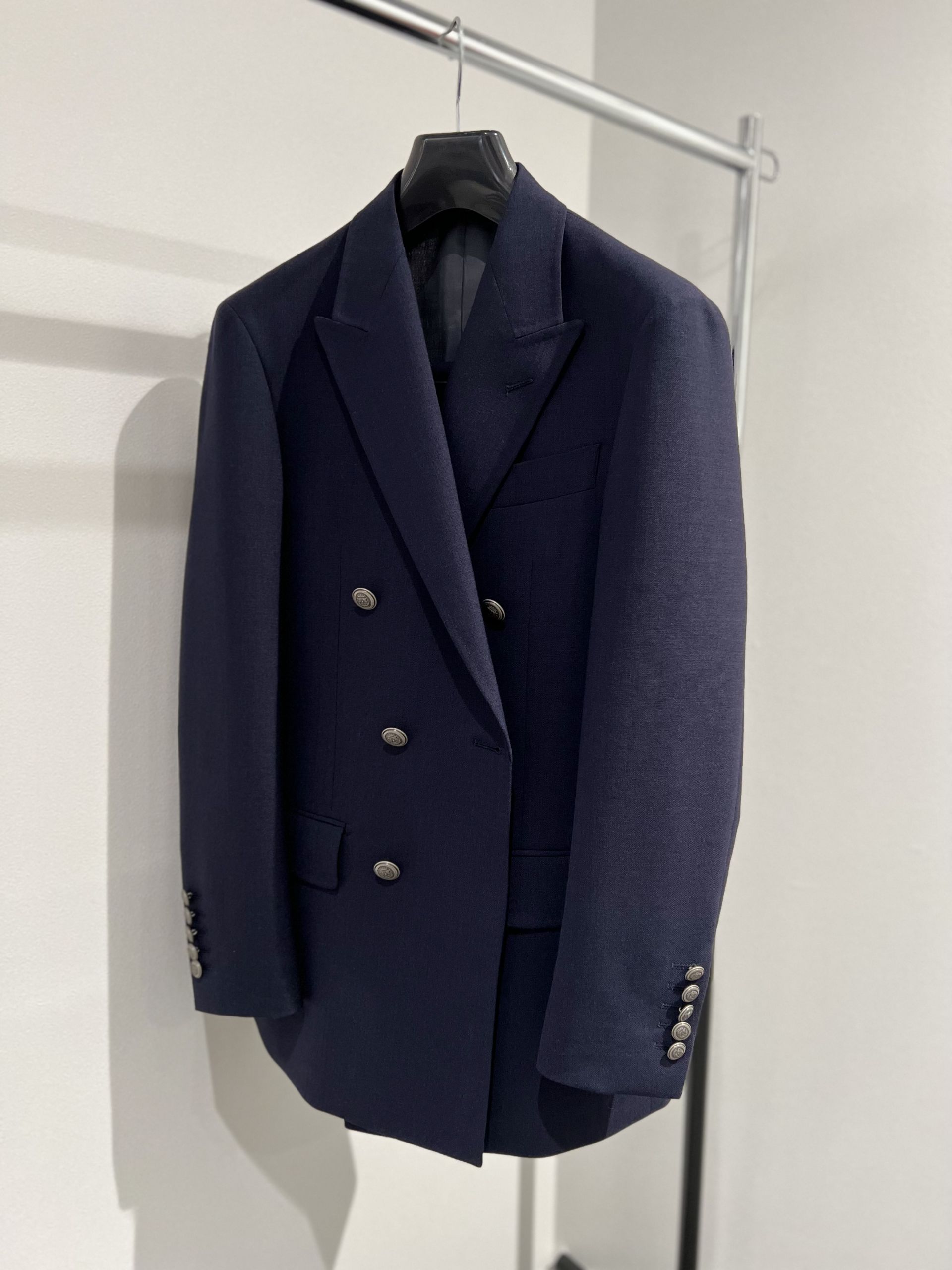 スーツは濃紺ののダブルスーツ。生地はフォックスブラザーズの平織(春夏用)です。